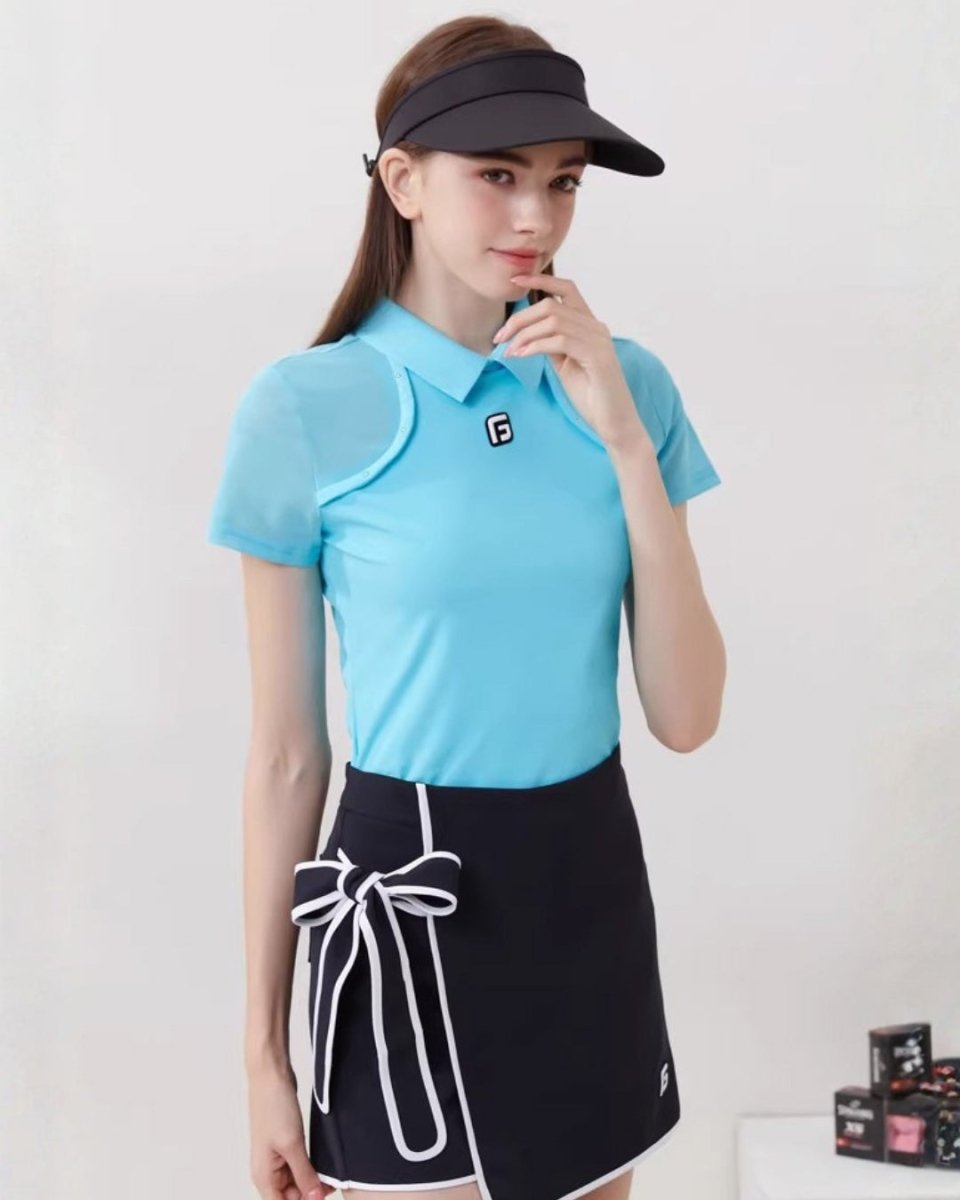 スカートは女性らしいラップデザインにサイドリボンをプラス。上品でフェミニンな印象を演出しながら、スタイルを美しく見せてくれるシルエットです。動きやすさにも配慮されており、ラウンドでも快適に着用できます。
