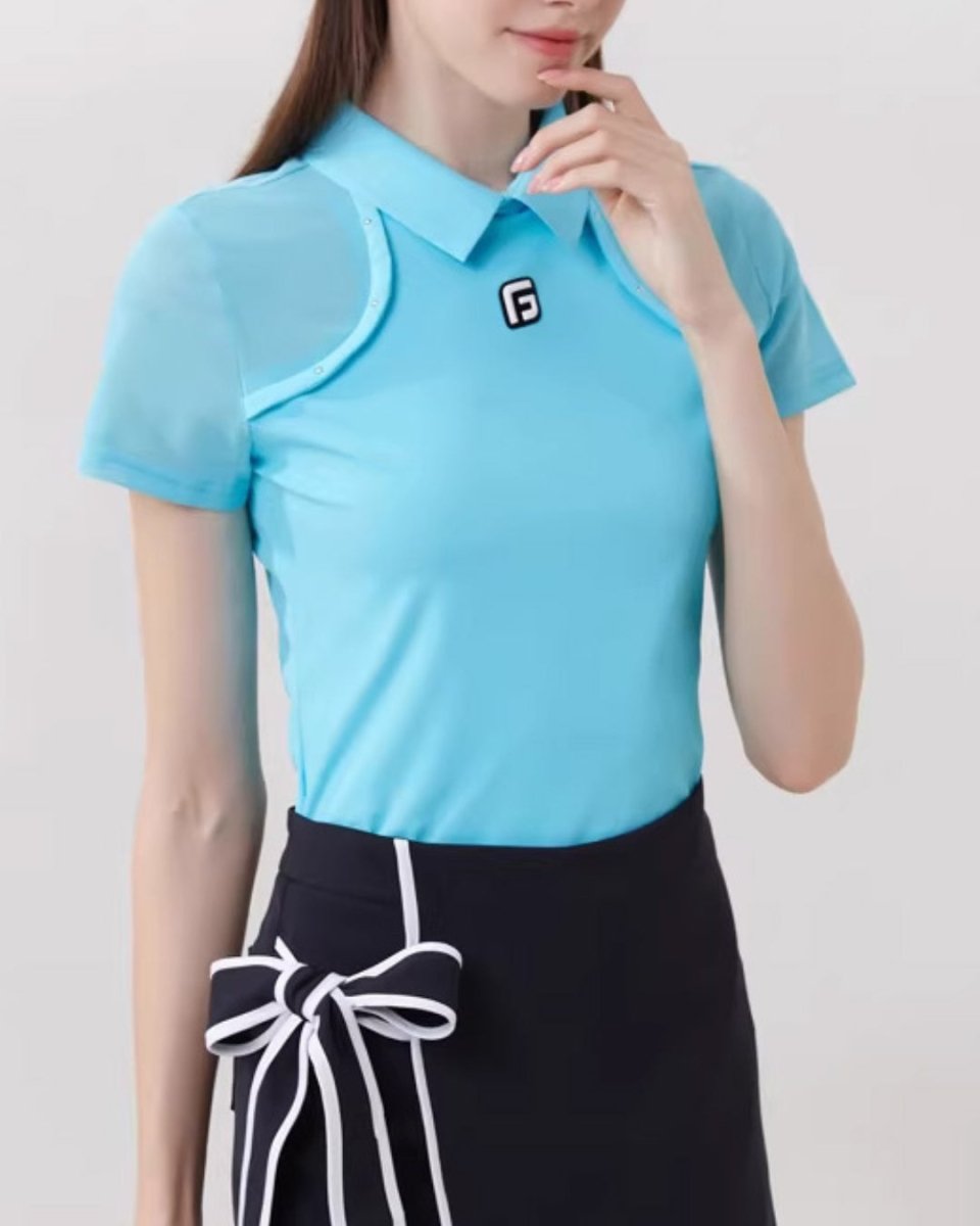 トップスはシンプルで上品な半袖デザイン。身体のラインを美しく見せるスリムフィットシルエットで、スポーティーさと女性らしさを兼ね備えた一枚です。伸縮性のある素材で動きやすく、スイング時も快適な着心地をサポートします。胸元のロゴがさりげないアクセントになり、洗練された印象に仕上げています。