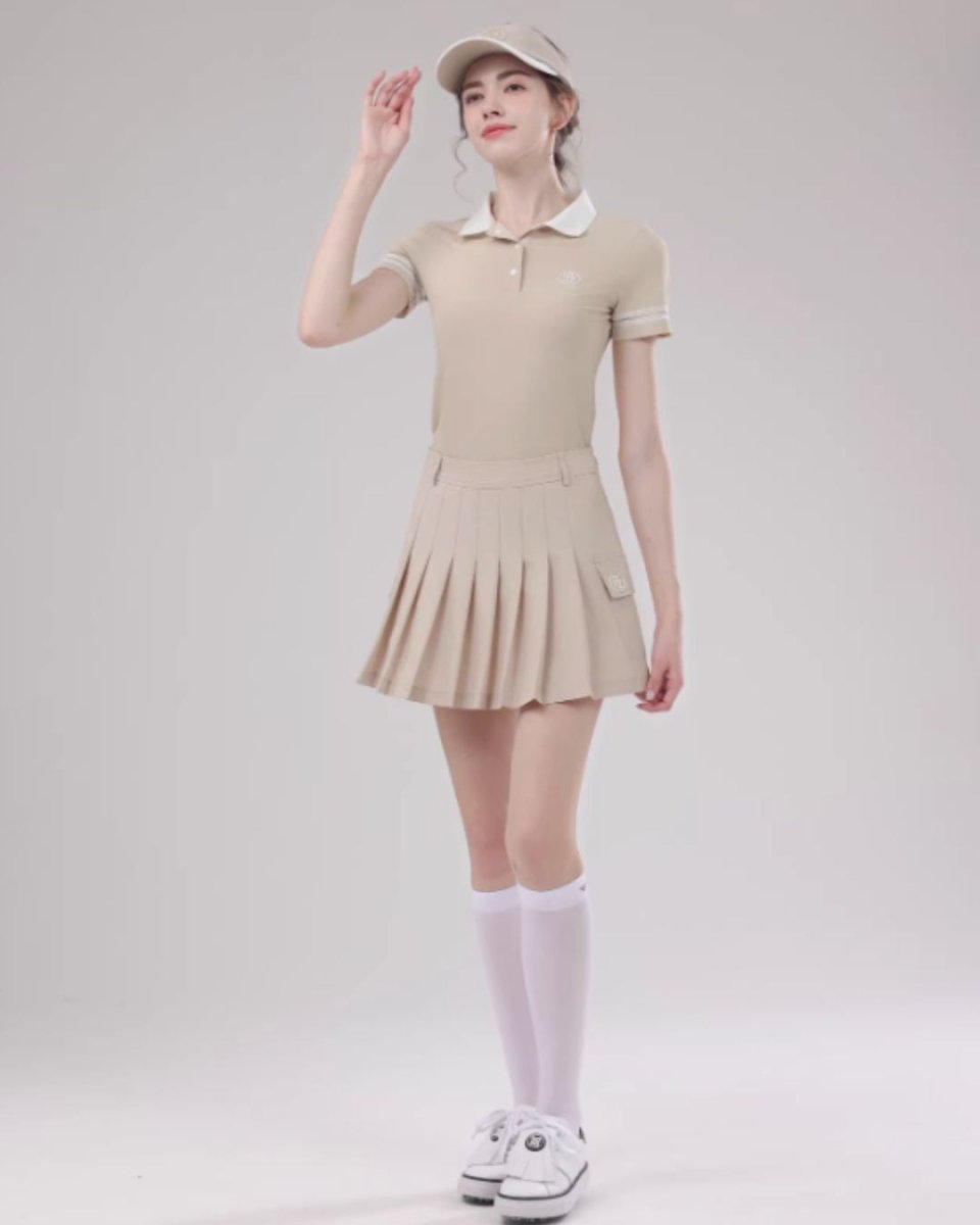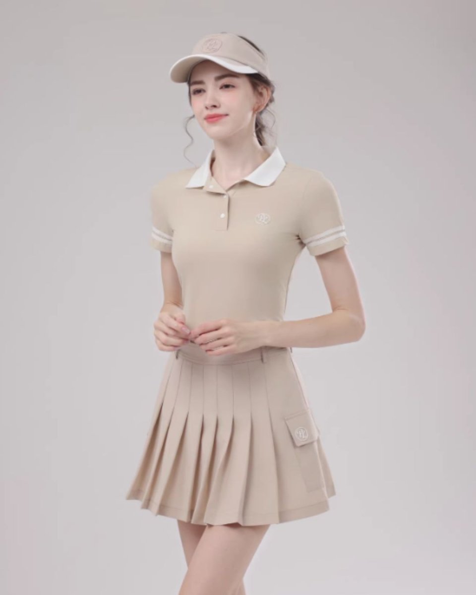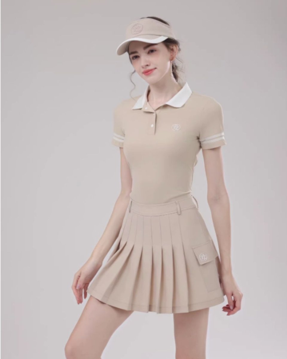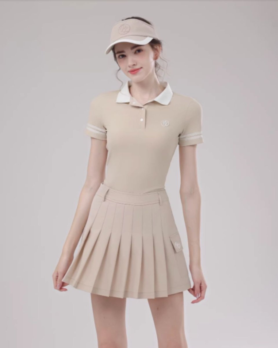 コンパクトなポロトップスとプリーツスカートの洗練ゴルフセットアップ。ウエストをきれいに見せる設計で、スタイルアップ効果も◎。上品なカラーリングでラウンドはもちろん練習やタウンユースにも活躍します。