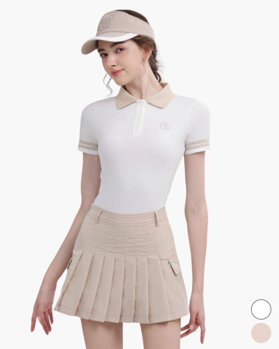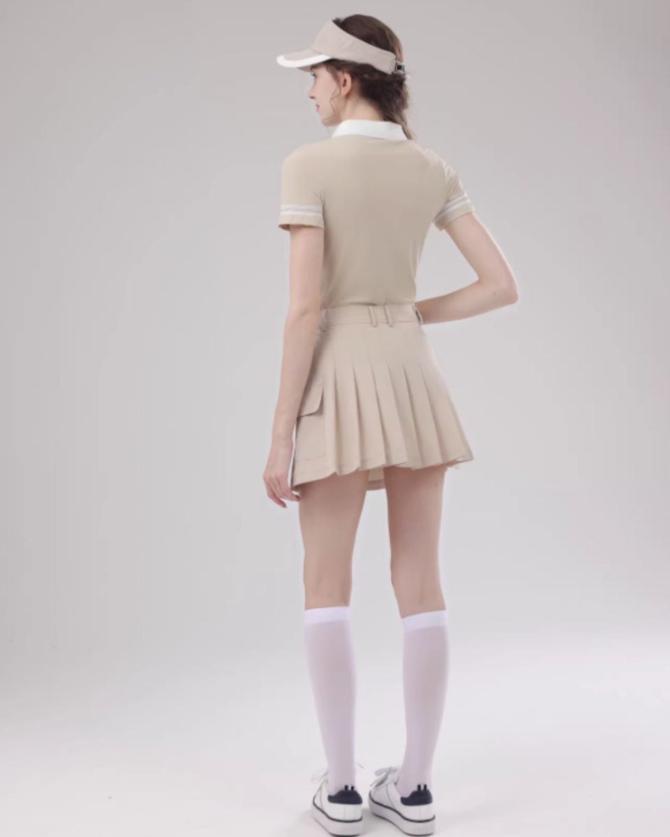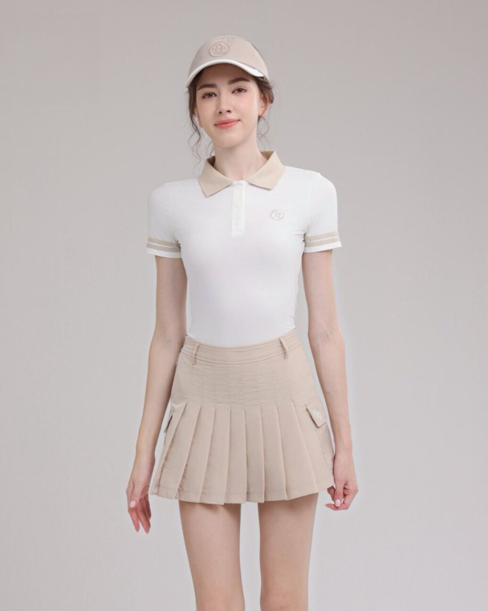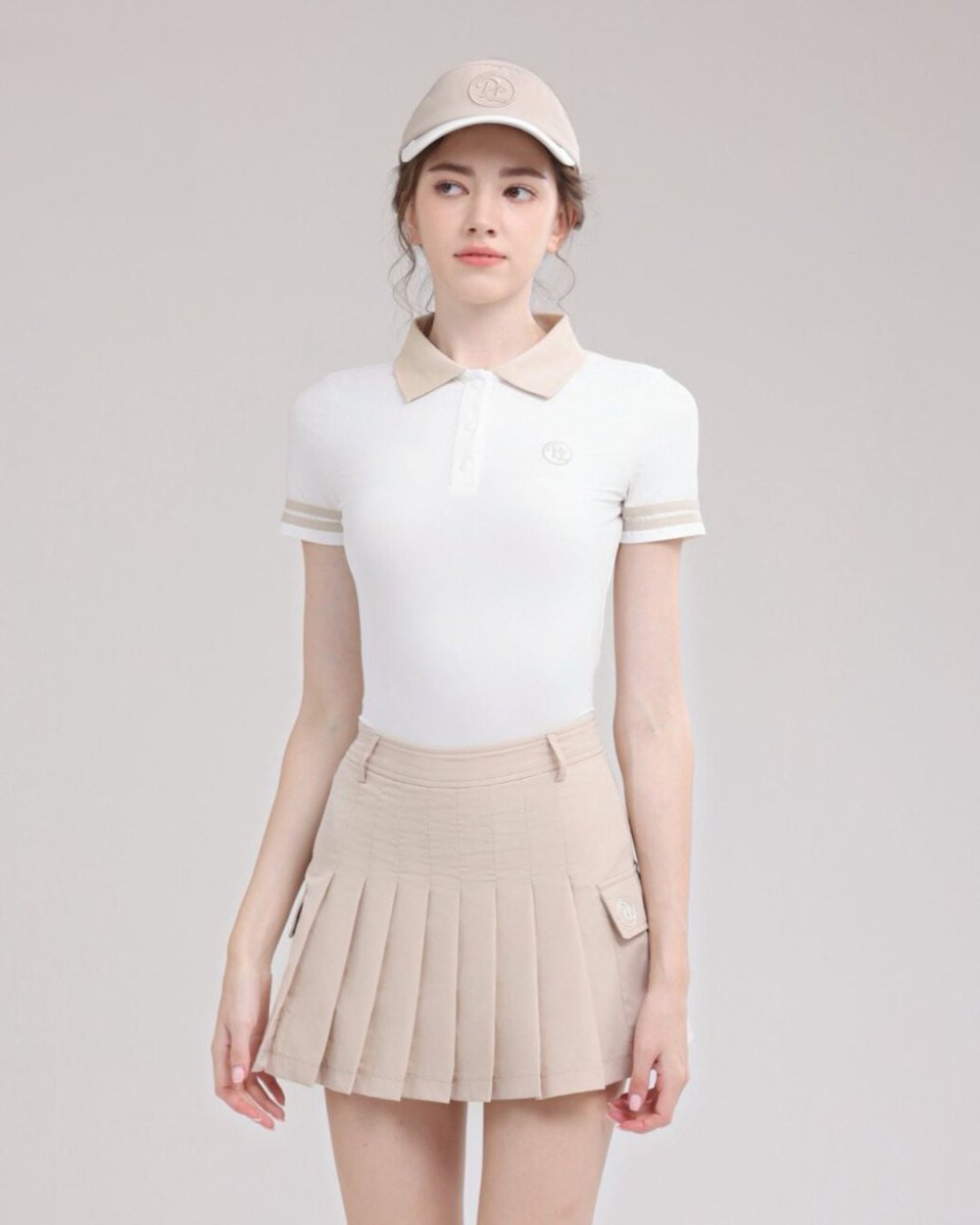 コンパクトなポロトップスとプリーツスカートの洗練ゴルフセットアップ。ウエストをきれいに見せる設計で、スタイルアップ効果も◎。上品なカラーリングでラウンドはもちろん練習やタウンユースにも活躍します。