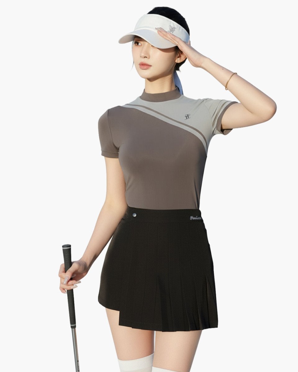 トップスはアシンメトリーなバイカラーデザインが特徴で、視線を引き締めながらスタイルアップ効果を演出。身体にフィットするシルエットとストレッチ性のある素材で、スイング時も快適な着心地を実現します。ハイネック仕様で上品さもプラス。