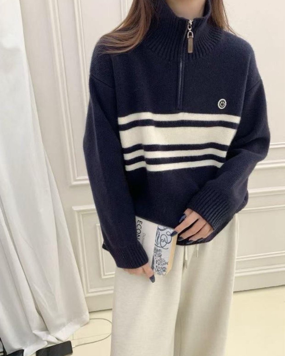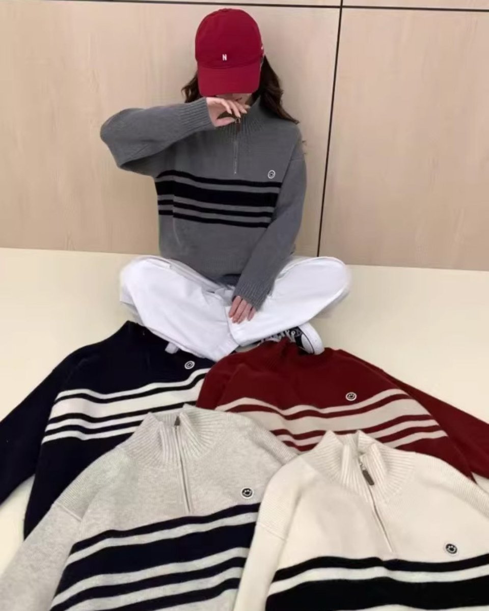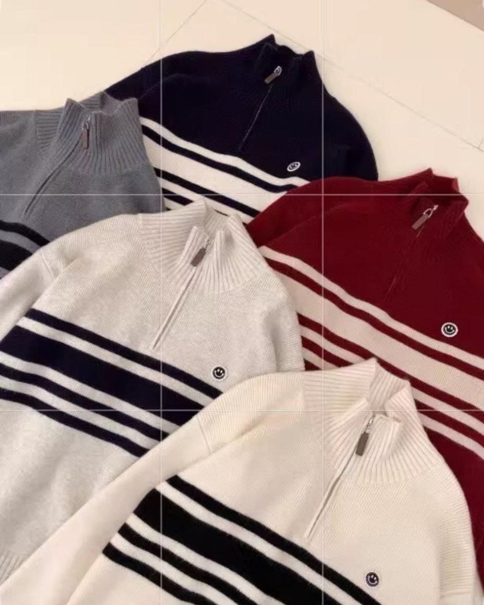 Lapelable stand-up collar, simple casual polo neck, half-zip striped knitwear, women's autumn cropped base sweater