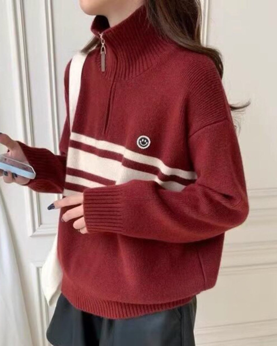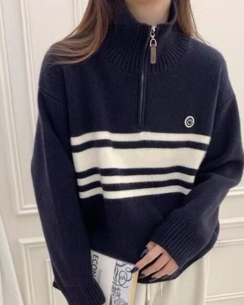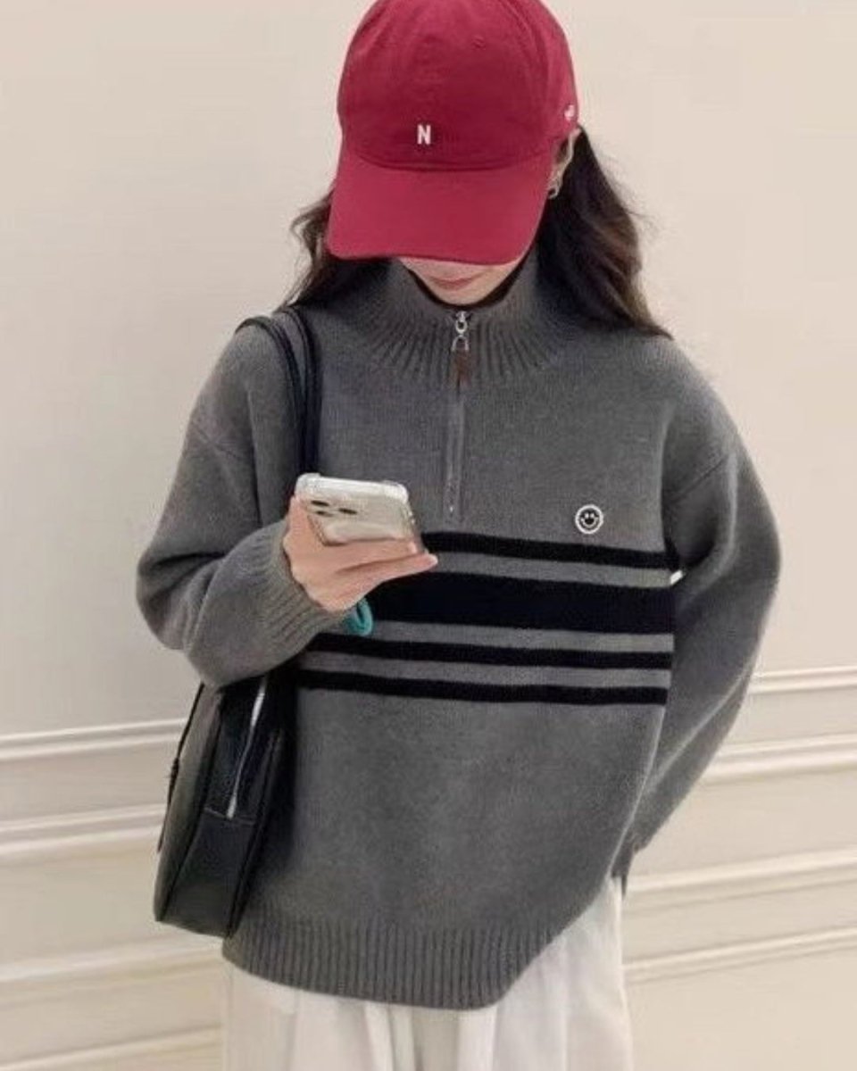 Lapelable stand-up collar, simple casual polo neck, half-zip striped knitwear, women's autumn cropped base sweater