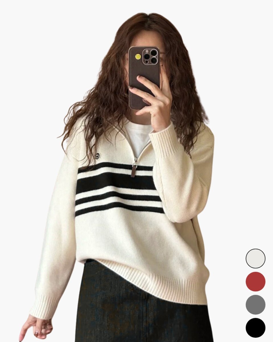 配色ラインがアクセントになるニットトップス。シンプルながら存在感があり、コーデに取り入れるだけでこなれた印象に仕上がります。ハーフジップ仕様で首元のアレンジも自在。ゆったりとしたシルエットで着心地も快適です。選べるカラーバリエーションで、気分やスタイルに合わせた着こなしを楽しめる一枚です。