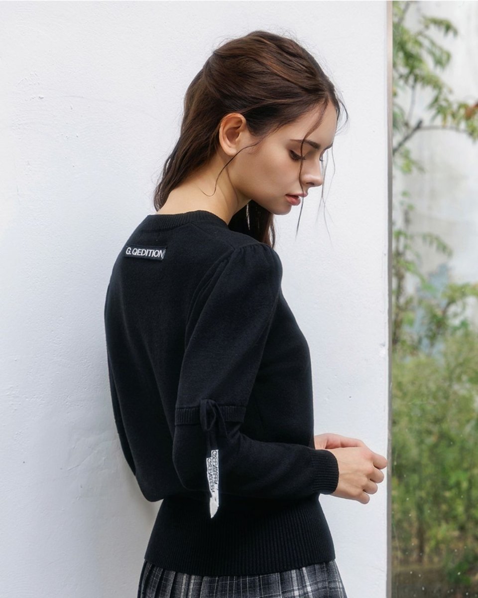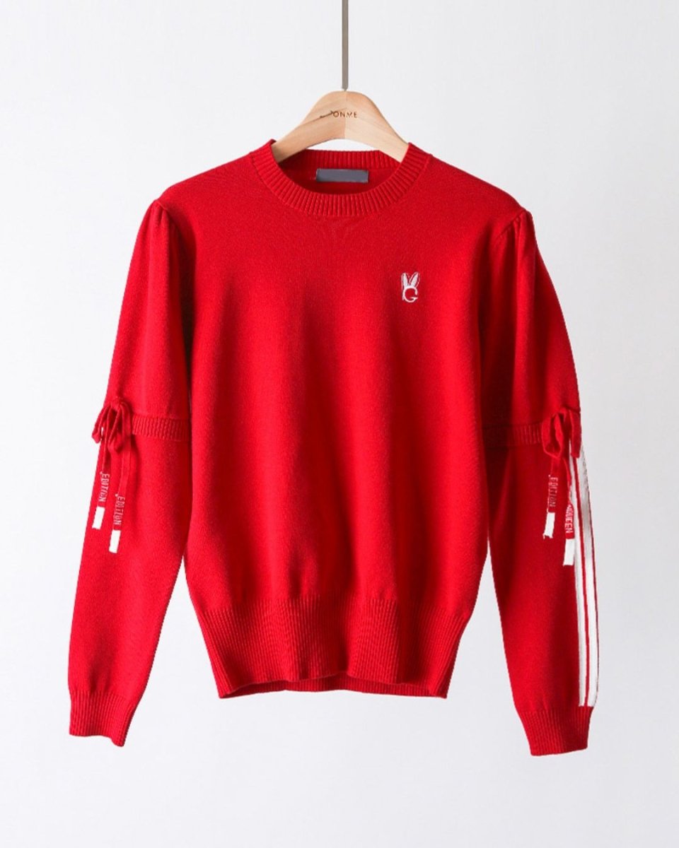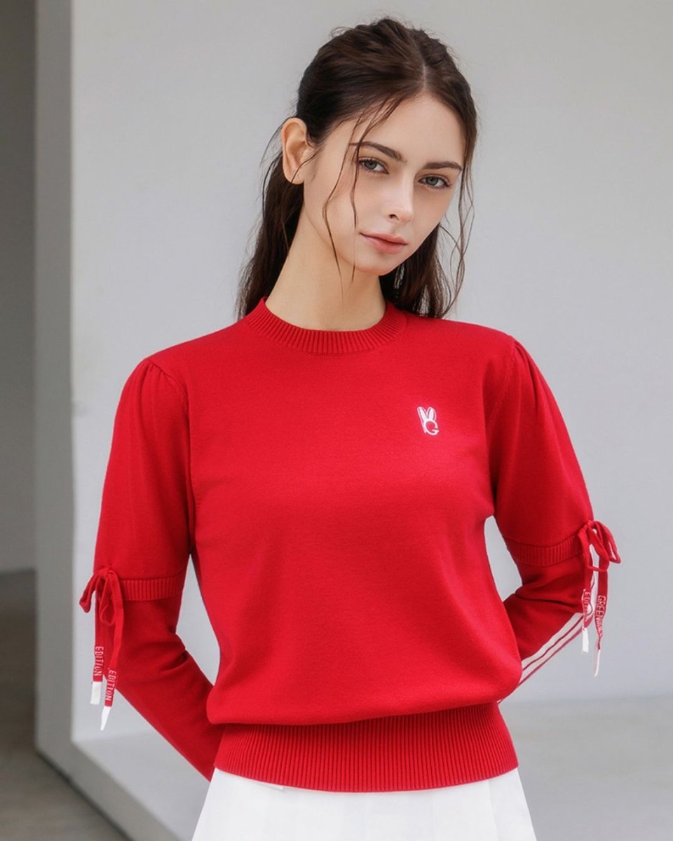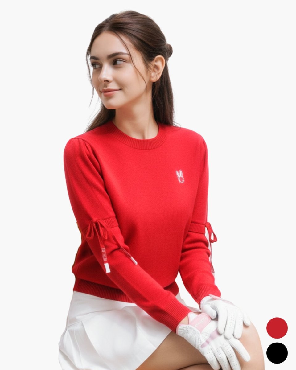 This women's golf knitwear features ribbon designs on the sleeves for a sophisticated look. Its comfortable fit allows for easy movement and reduces stress during your swing. The simple crew neck adds an accent, making it perfect for the golf course, practice, or everyday wear. It pairs well with skirts and pants, adding a touch of glamour to your fall and winter golf outfits.