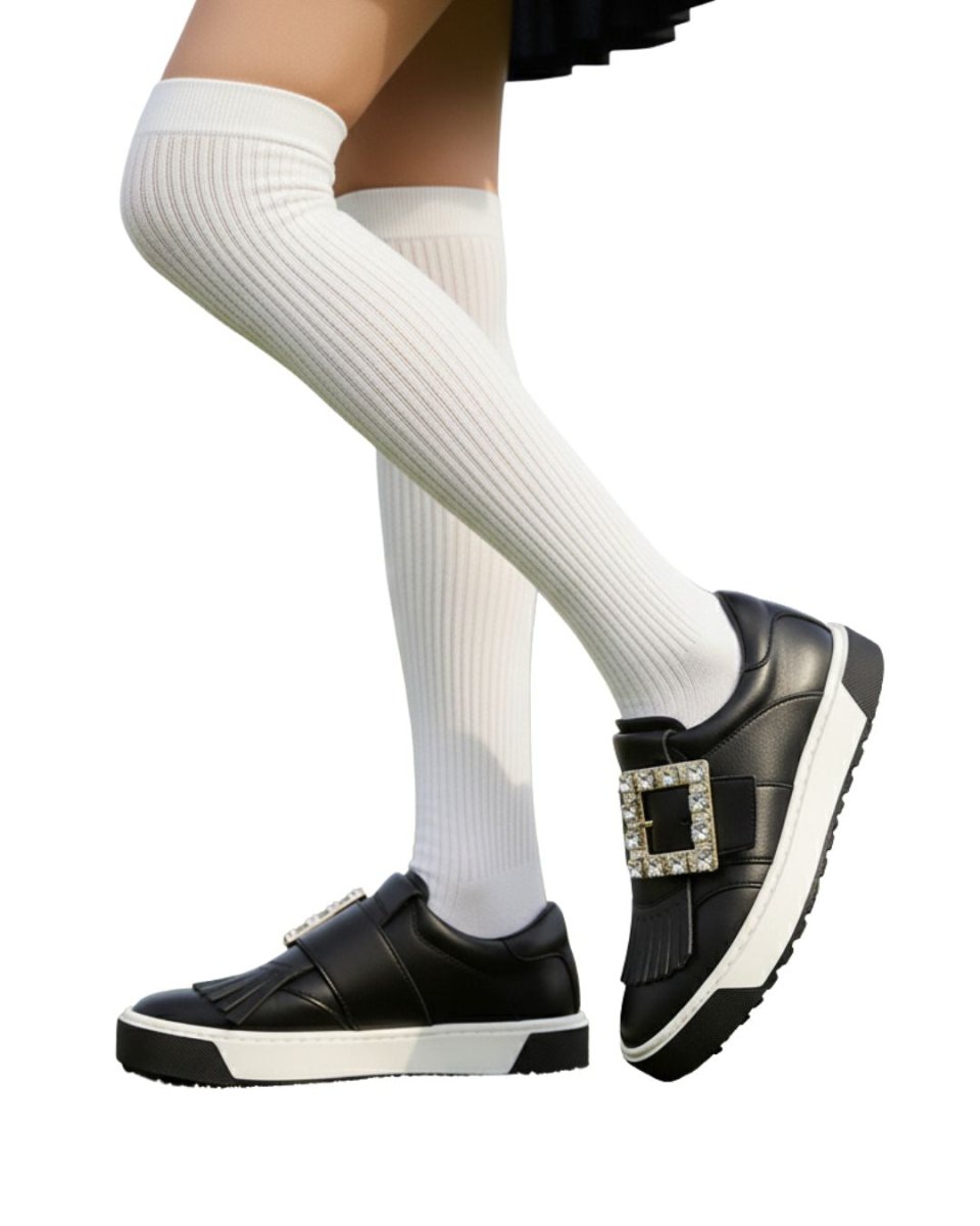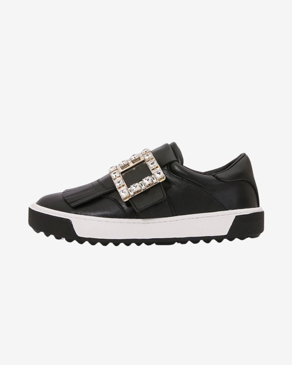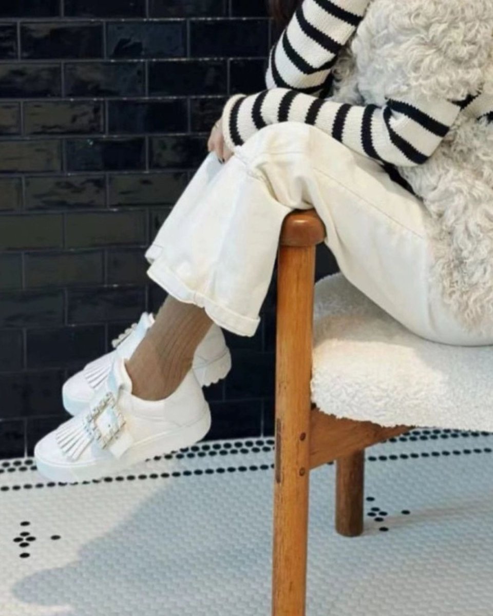 RV Tassel Diamond Buckle White Shoes Women's Leather Platform Sole Casual Board Shoes Color Blocking One-Foot Slippers Single Shoes Golf Shoes