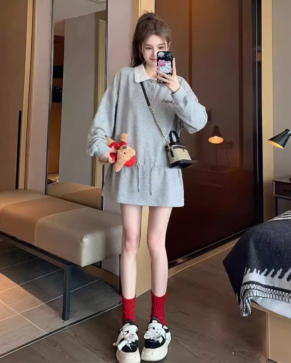 Korean version of sweet college style splicing, polo collar, long sleeve sweatshirt, women's early spring new drawstring, versatile chic top
