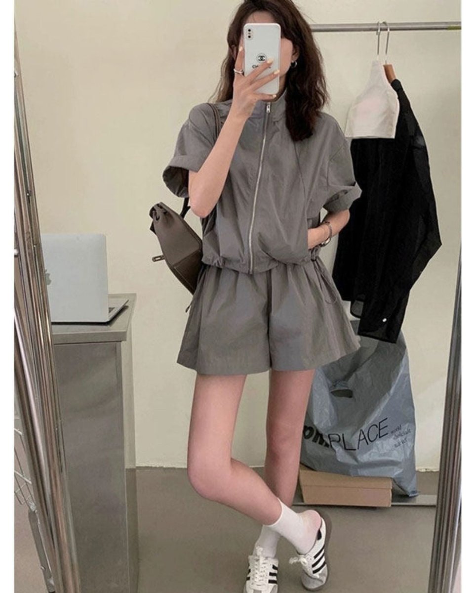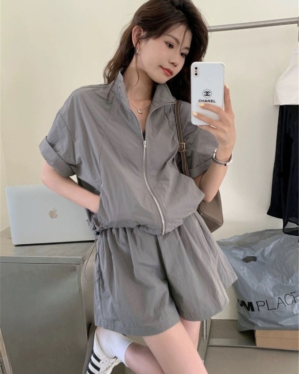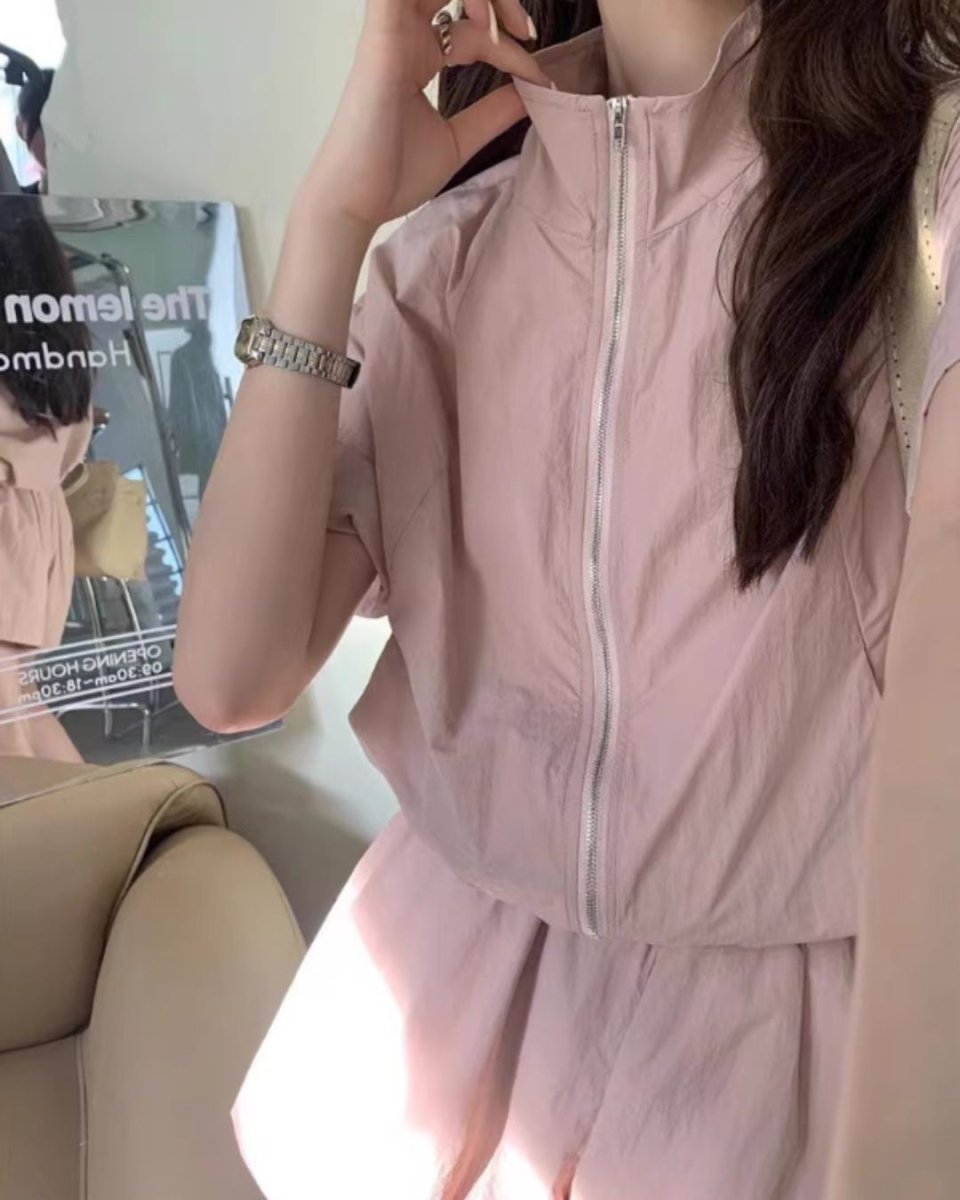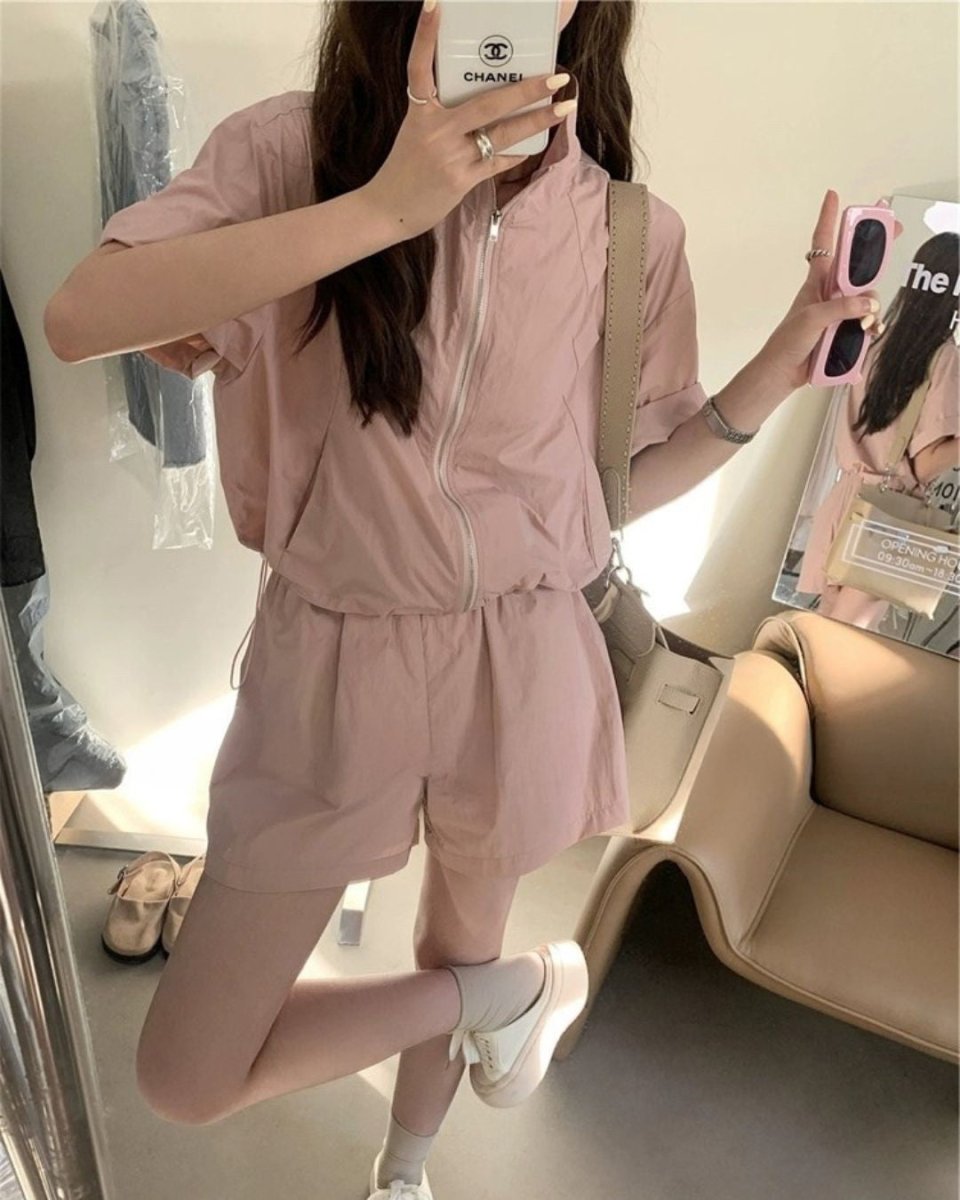 Korean Women's Summer Sports Suit, Lightweight and Loose Fit, Slim Fit, Sun Protection, Short Sleeve Jacket and Wide Leg Shorts, Casual Two-Piece Set