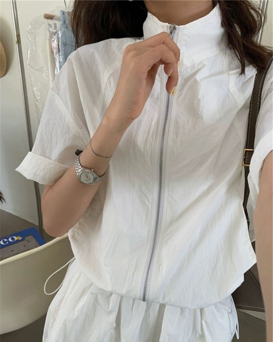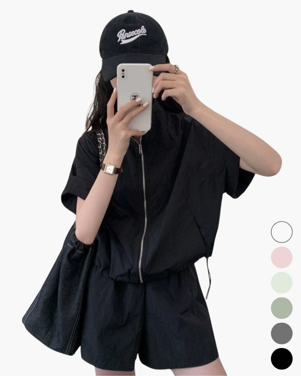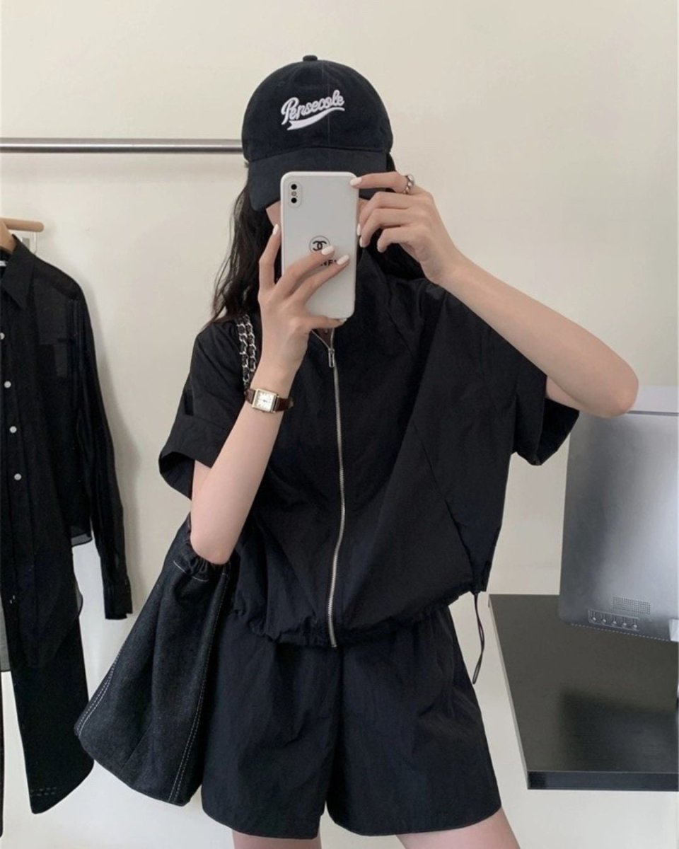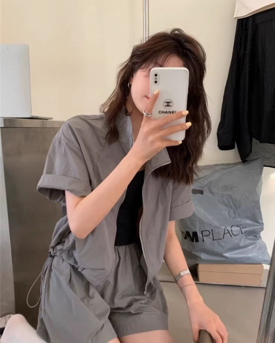 Korean Women's Summer Sports Suit, Lightweight and Loose Fit, Slim Fit, Sun Protection, Short Sleeve Jacket and Wide Leg Shorts, Casual Two-Piece Set