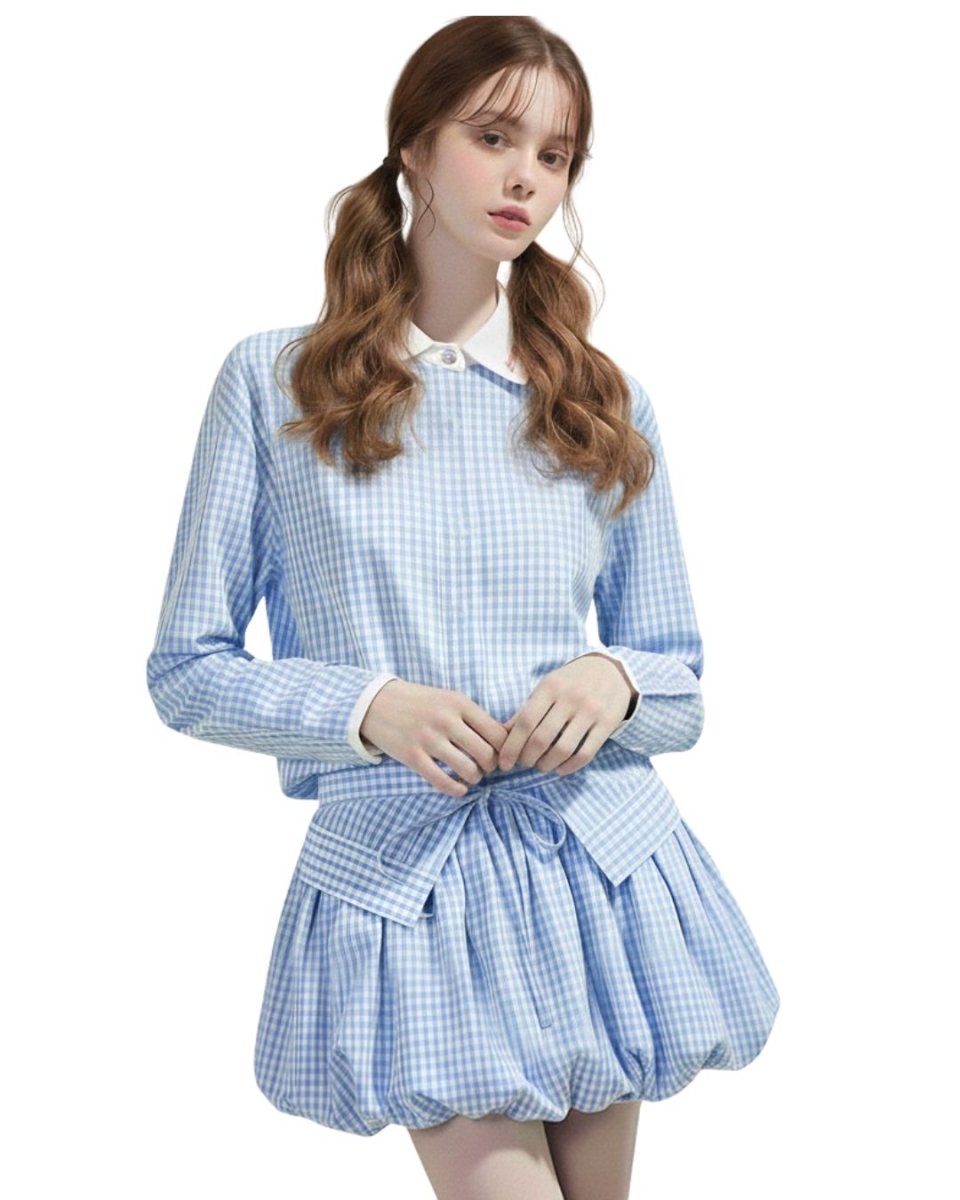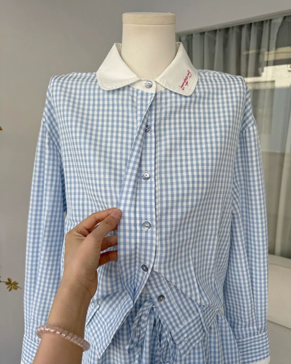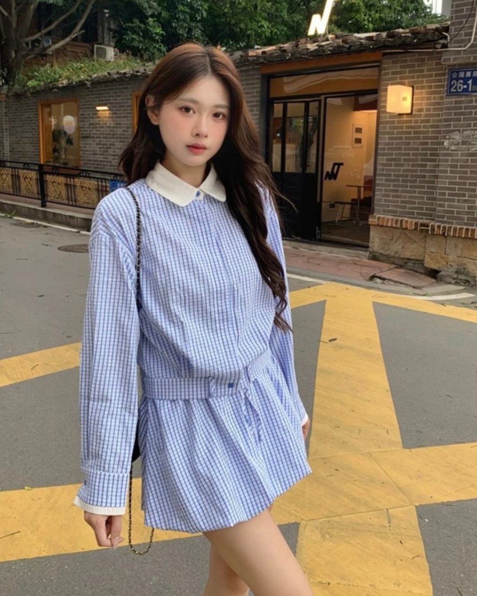 aaaaxbbb Ensemble bleu clair à carreaux, chemise à revers, jupe boutonnée, jupe courte, haut à lacets contrastant, fille