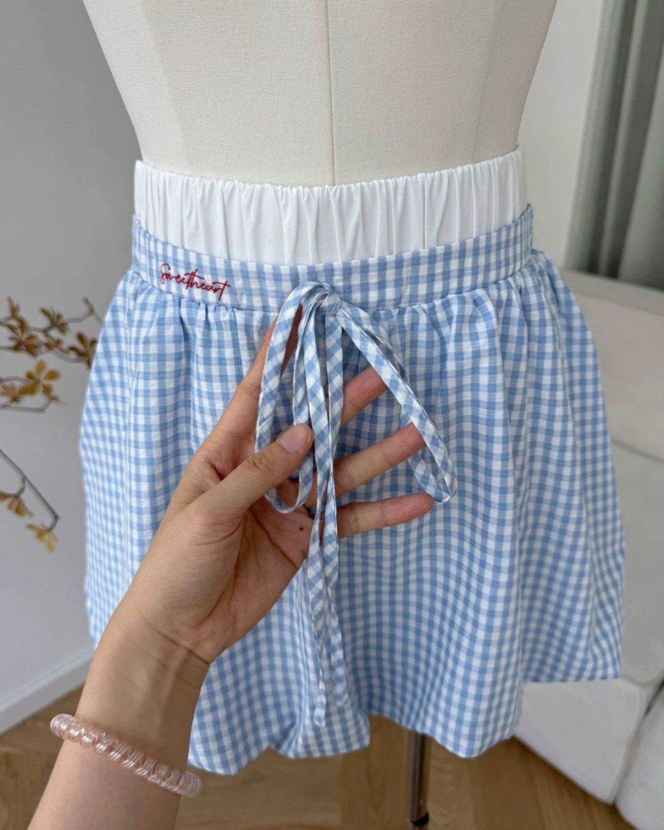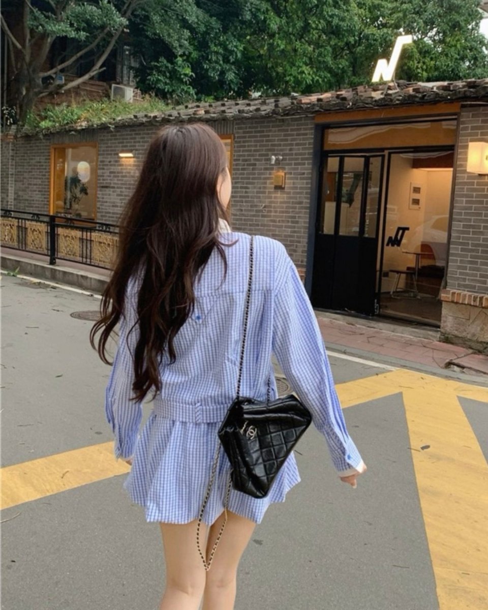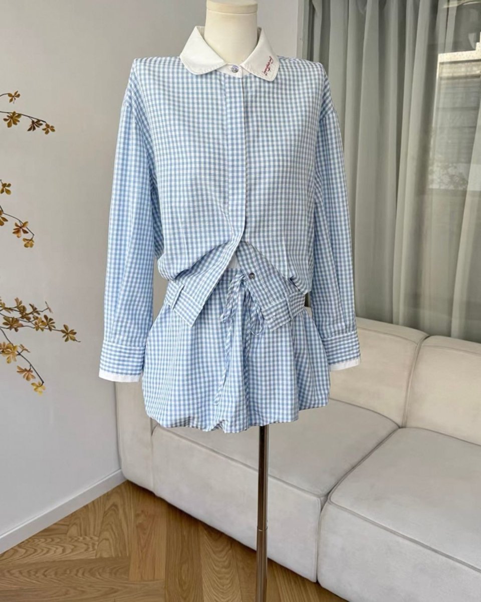 aaaaxbbb Ensemble bleu clair à carreaux, chemise à revers, jupe boutonnée, jupe courte, haut à lacets contrastant, fille