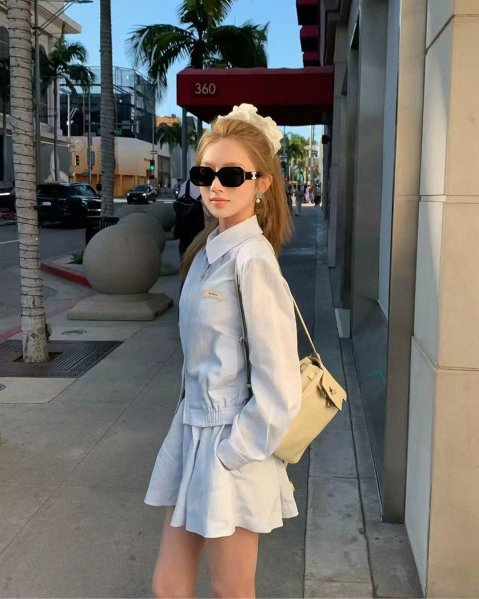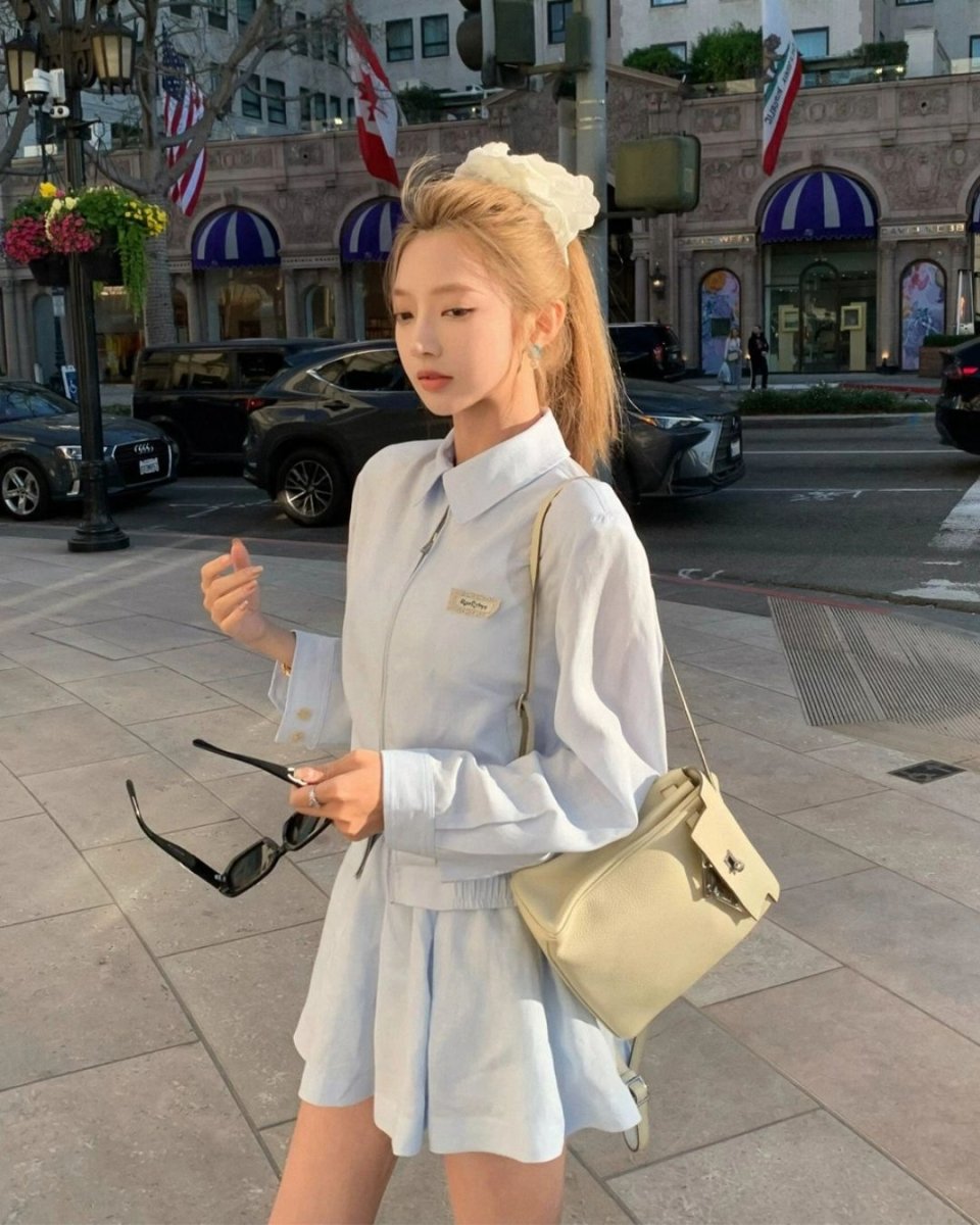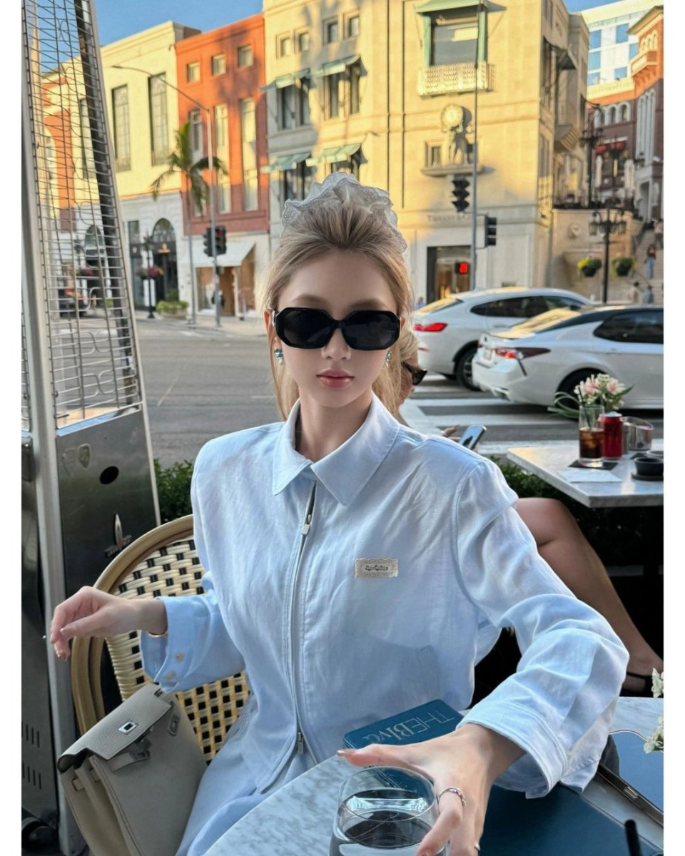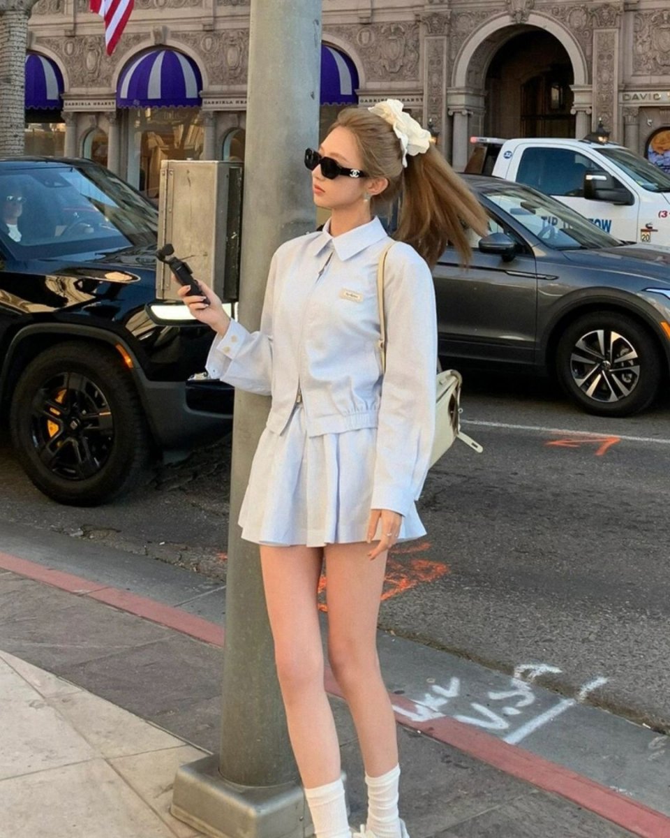 韓国風ジップアップシャツ&プリーツスカート風ショートパンツのセットアップ。