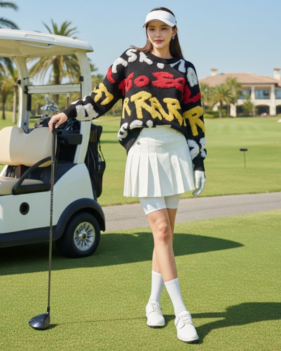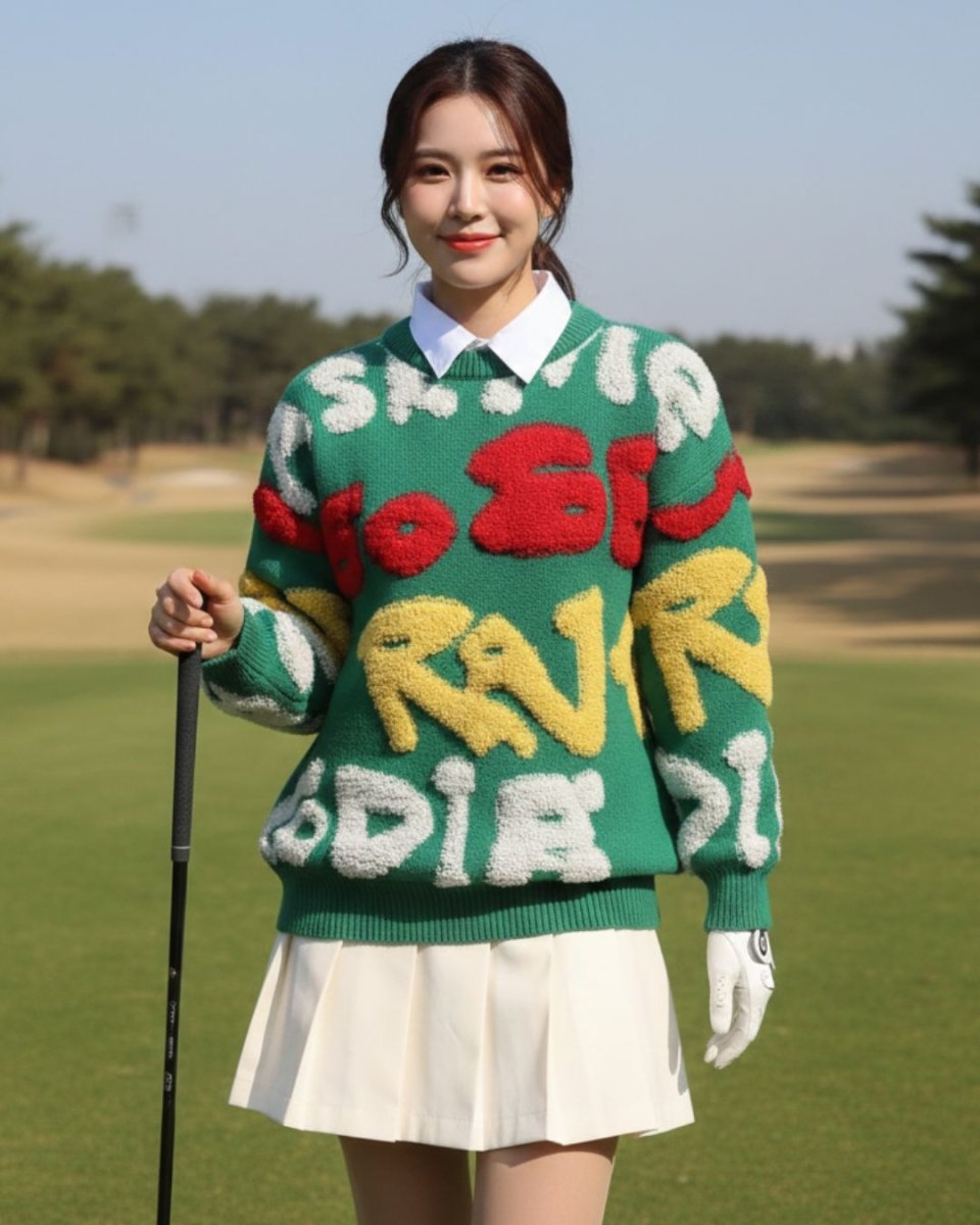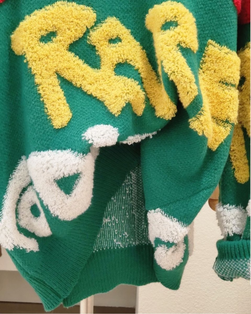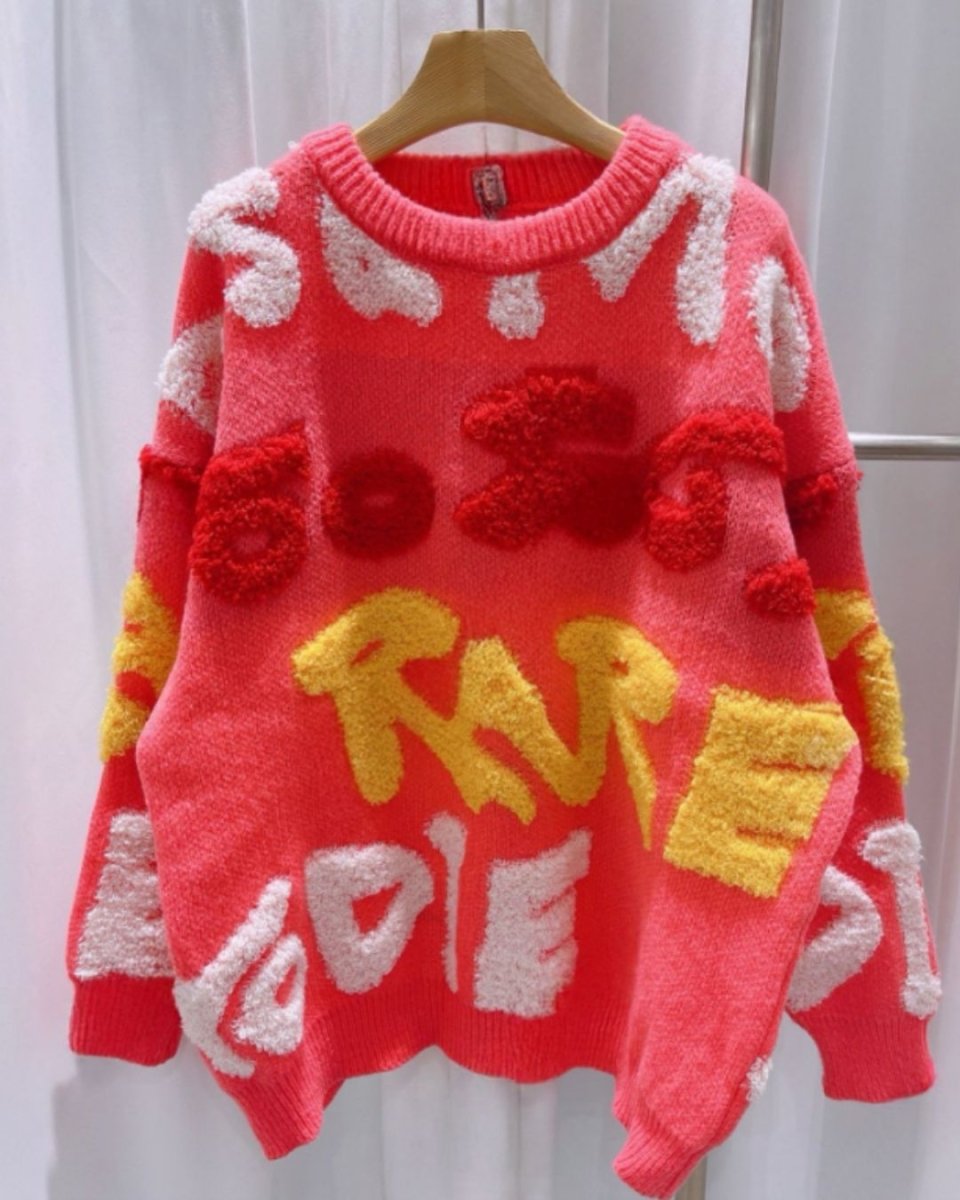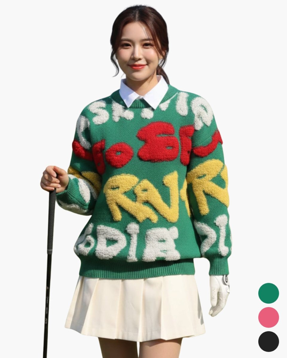 Tá lógó suntasach ar an mbarr cniotáilte seo, déanta as cniotáil shaggy tríthoiseach. Fágann an scéim dathanna geala agus an scáthchruth measartha scaoilte gurb é lárphointe do chulaith é. Coinníonn an fabraic chniotáilte thiubh thú te, agus is féidir é a phéireáil le bunanna simplí chun cuma stylish a chruthú.