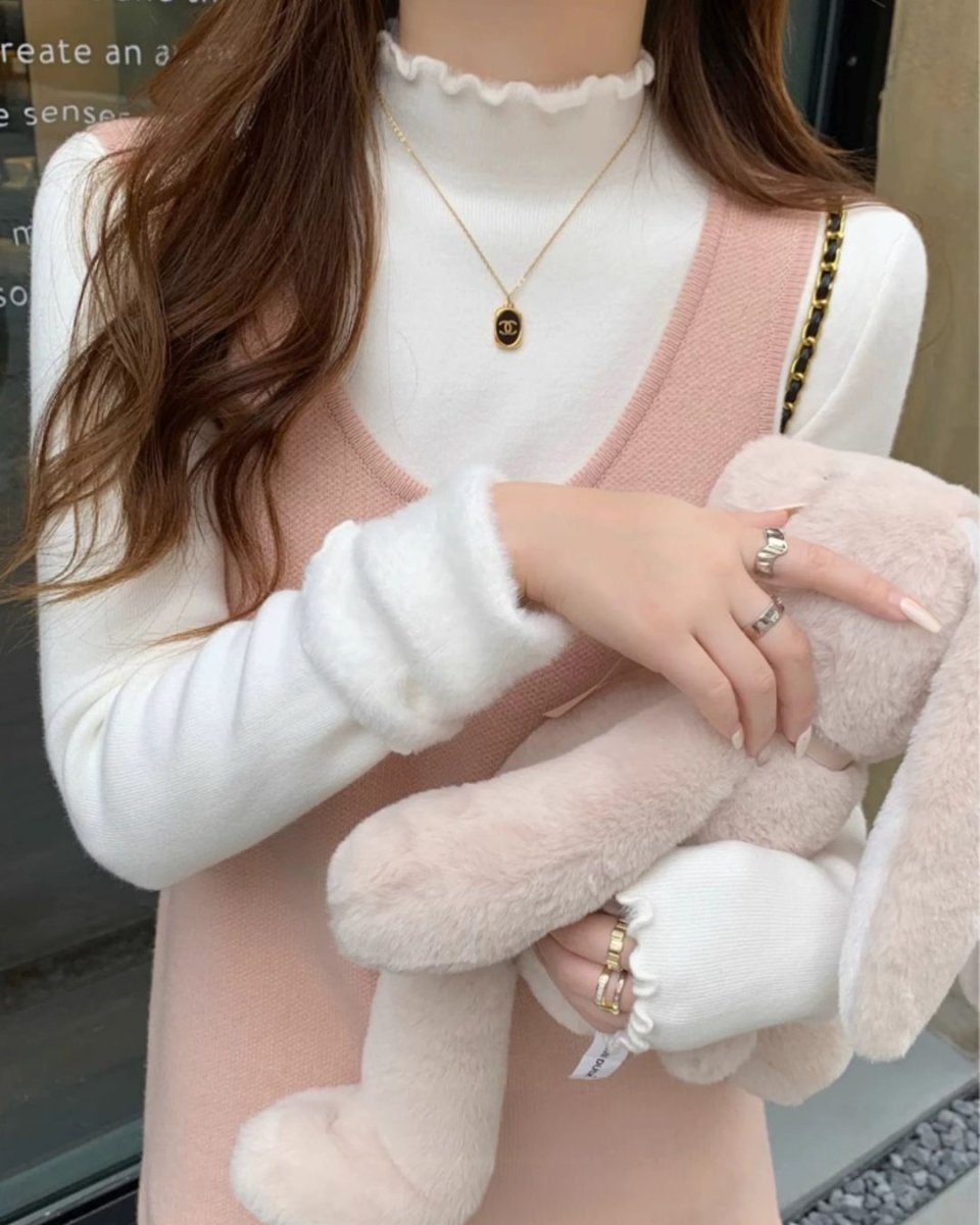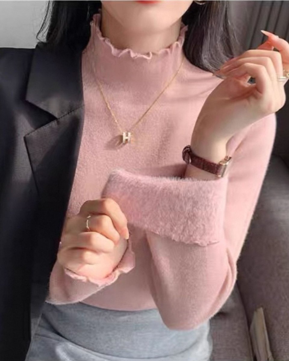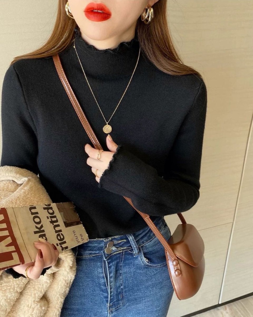 Atasan Korea tebal, atasan hitam mewah model semi-turtleneck, pakaian dalam fleece one-piece, sweater, lapisan dasar rajutan hangat untuk wanita di musim gugur dan musim dingin.