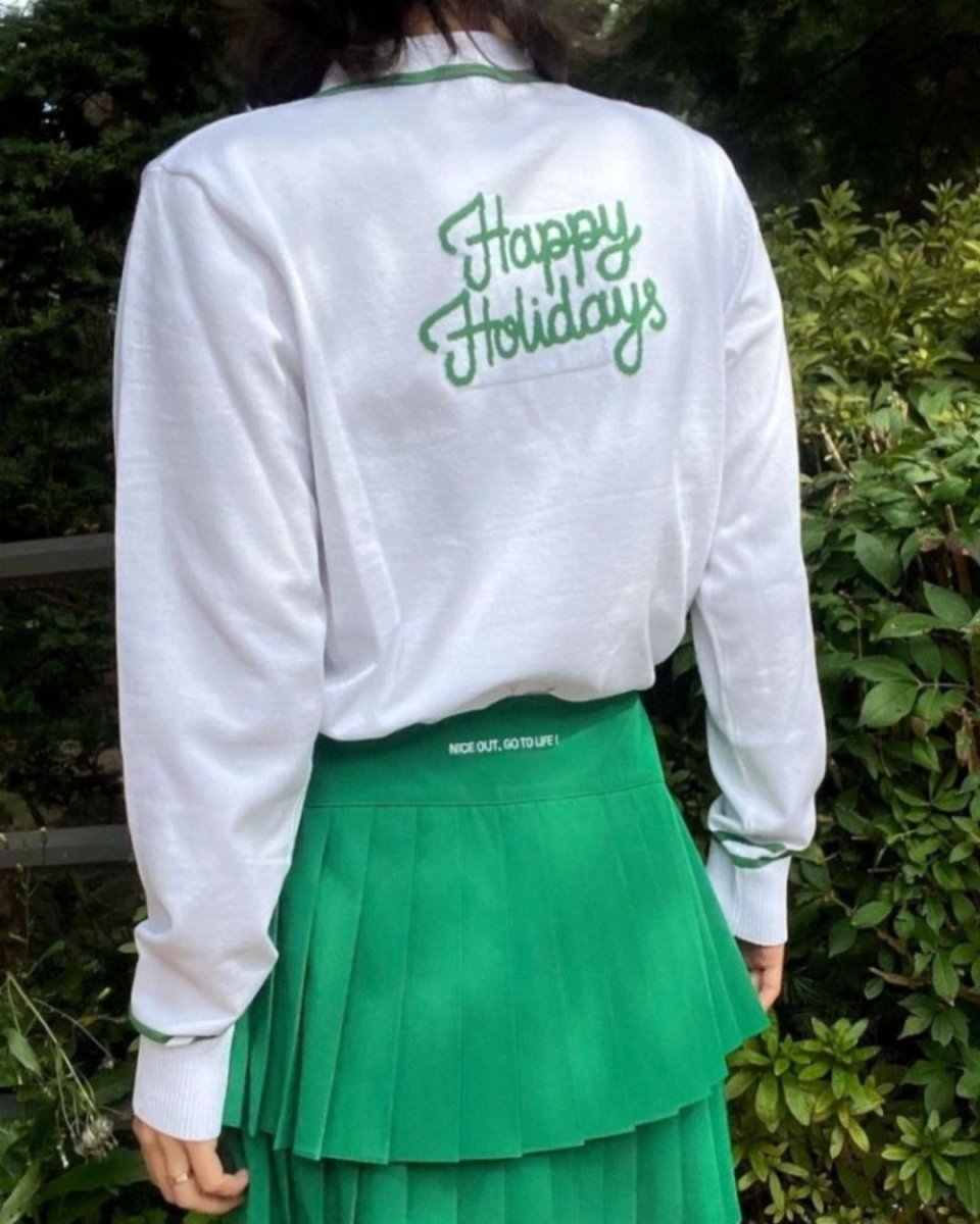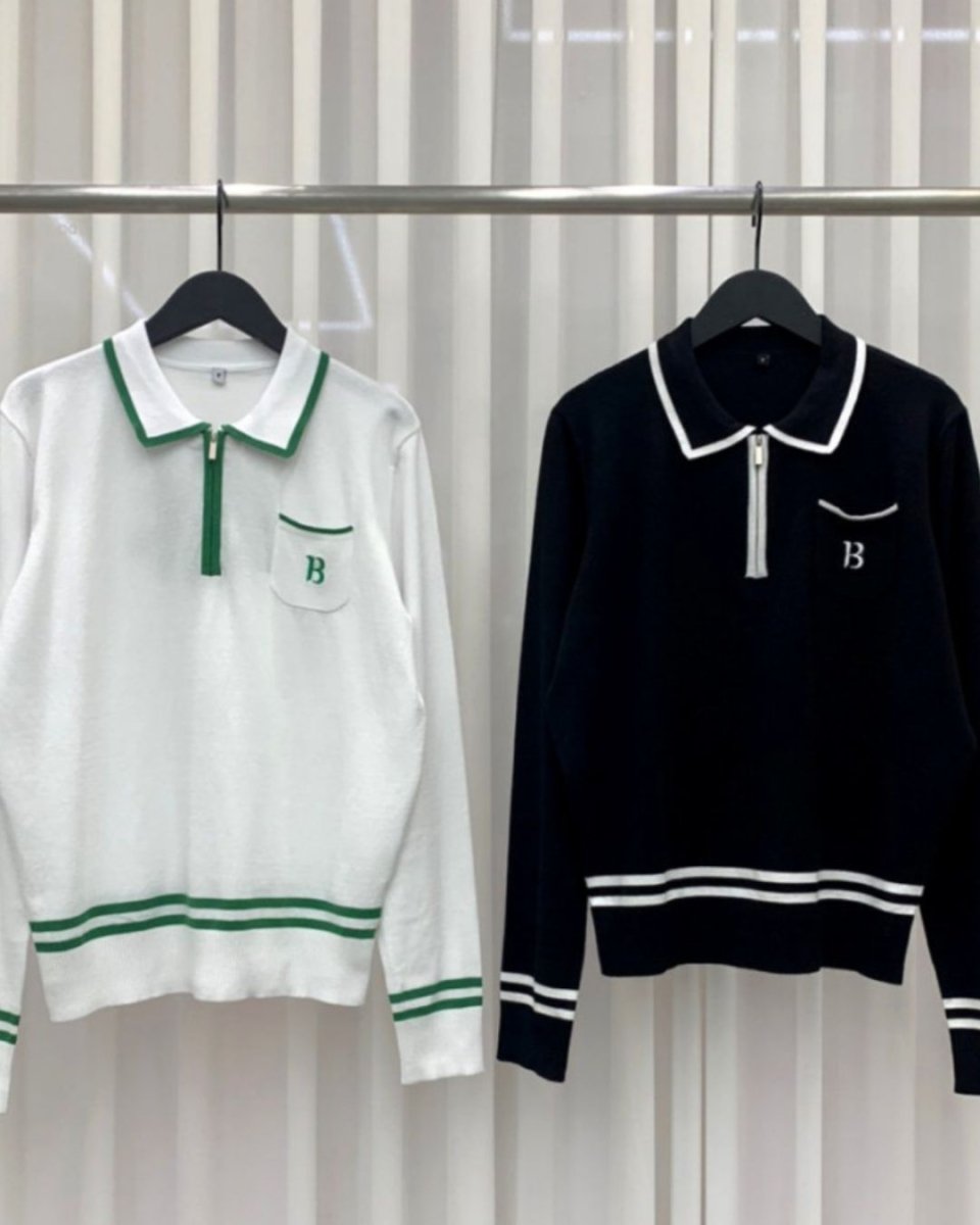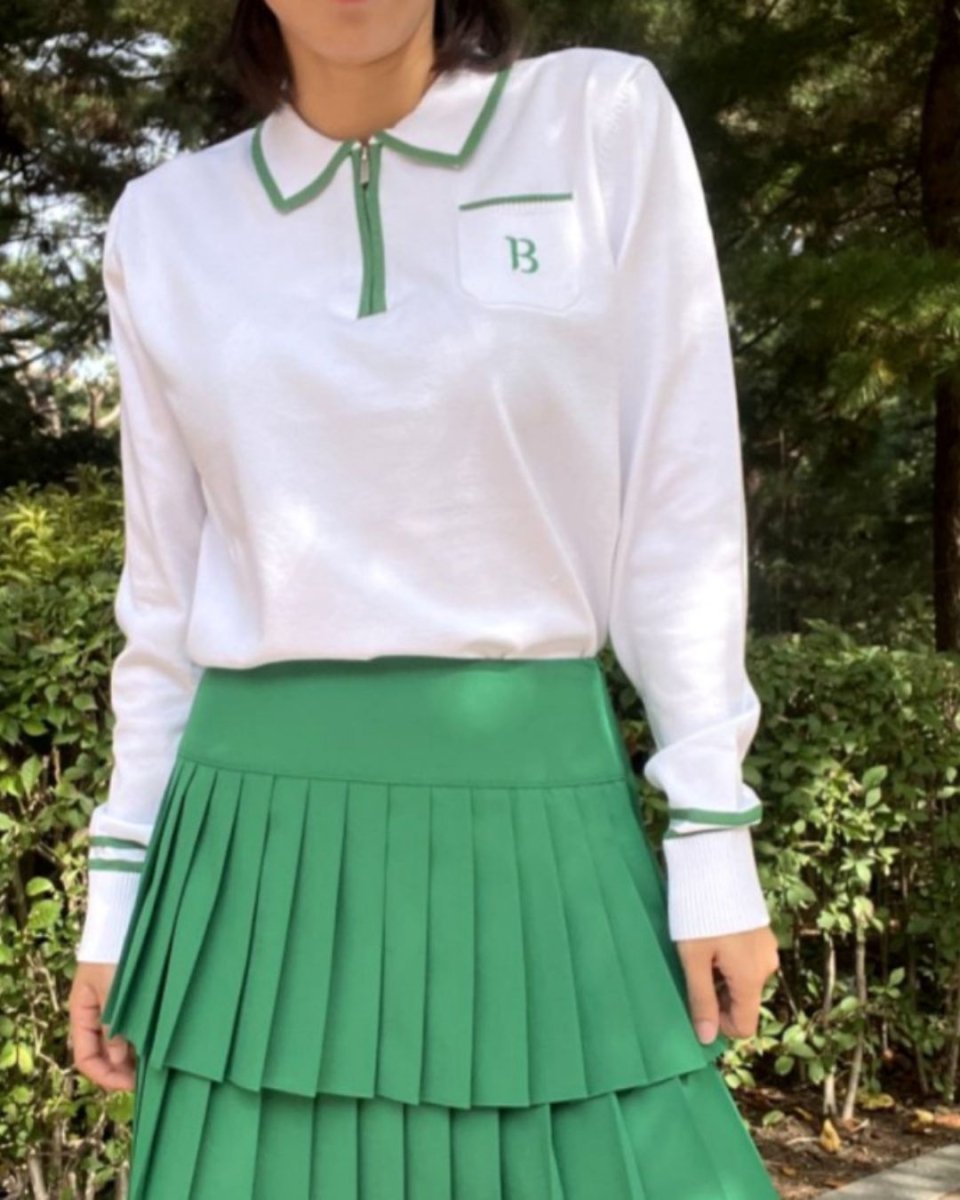 Atasan setengah resleting dengan kerah ini memiliki dasar putih dengan garis-garis berwarna hijau yang mencolok. Siluetnya yang longgar memungkinkan kemudahan bergerak dan keanggunan. Manset dan kerah berwarna menambahkan aksen gaya pada setiap pakaian, dan cocok dipadukan dengan rok. Ini adalah pakaian serbaguna yang dapat dikenakan tidak hanya di lapangan golf, tetapi juga untuk latihan dan acara lain di luar golf.