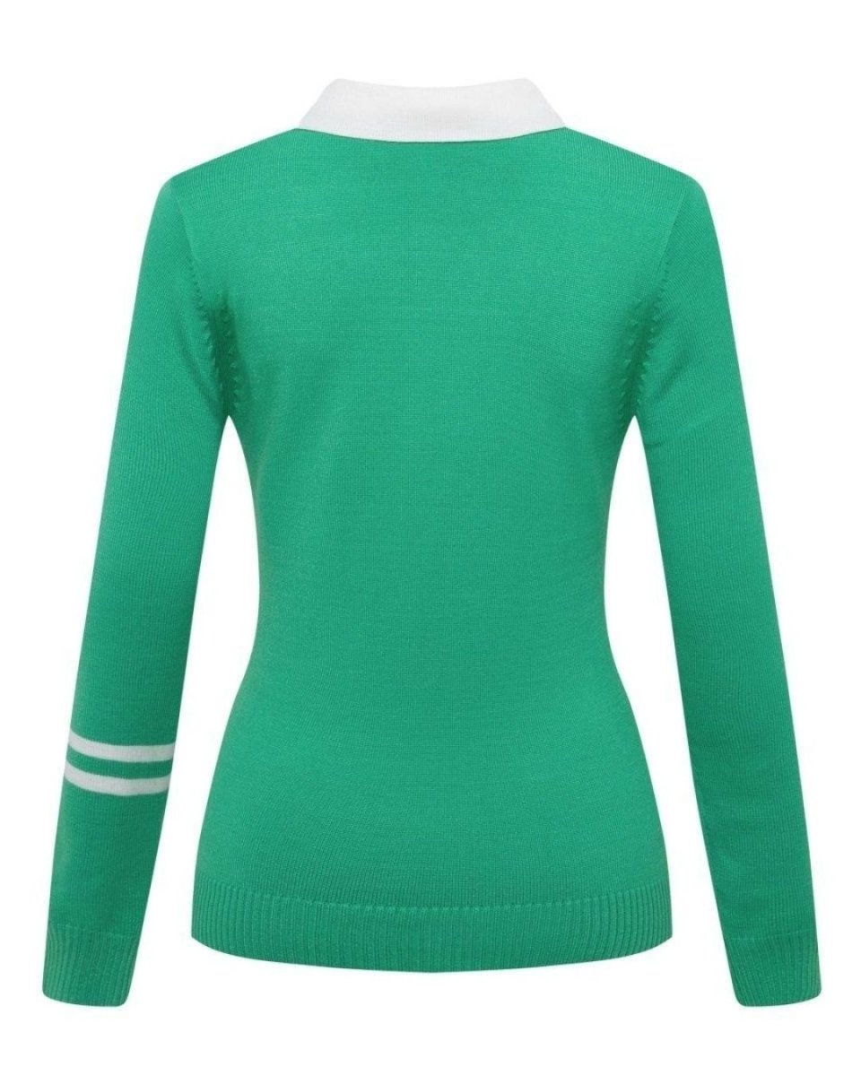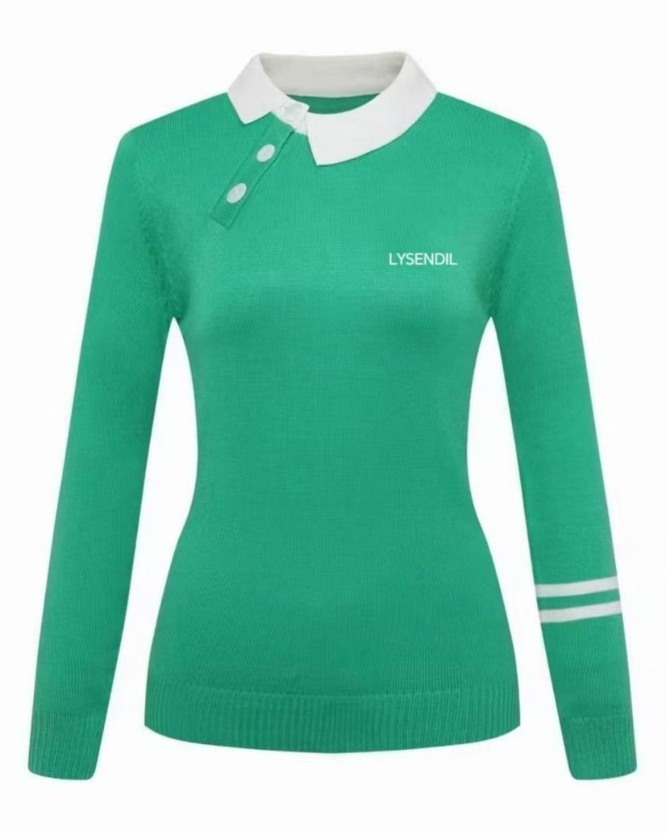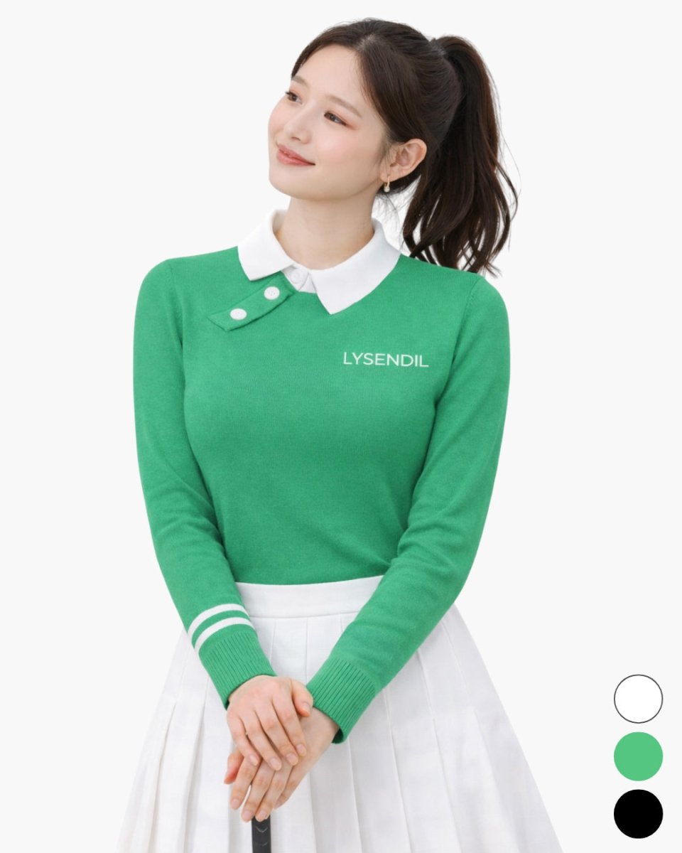 上品な配色衿が印象的な長袖ポロニットゴルフウェア。すっきりとしたシルエットで、女性らしいラインを美しく演出します。柔らかなニット素材は程よい伸縮性があり、スイング時も快適な着心地。シンプルながら洗練されたデザインで、ラウンドはもちろん練習や行き帰りのコーデにも自然になじみます。