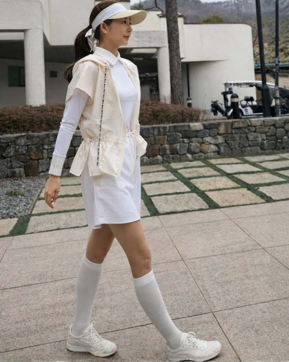 ウエストをきゅっと絞ったフレアシルエットが女性らしさを引き立てる、上品なジャンパーゴルフウェア。