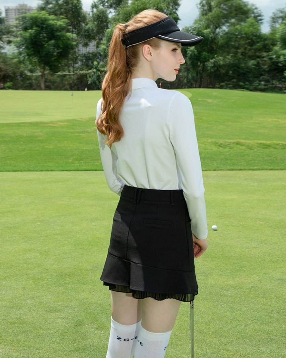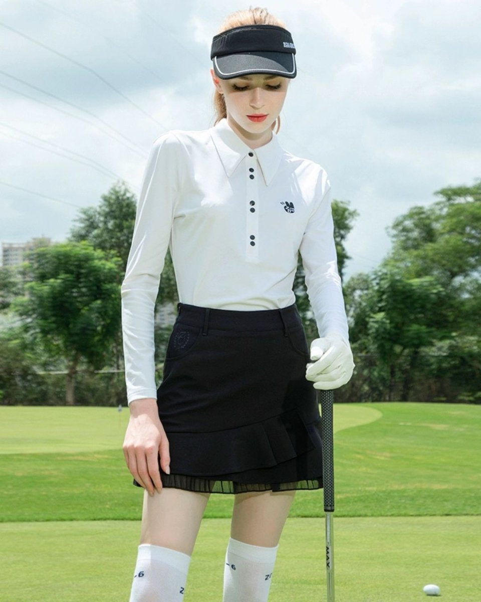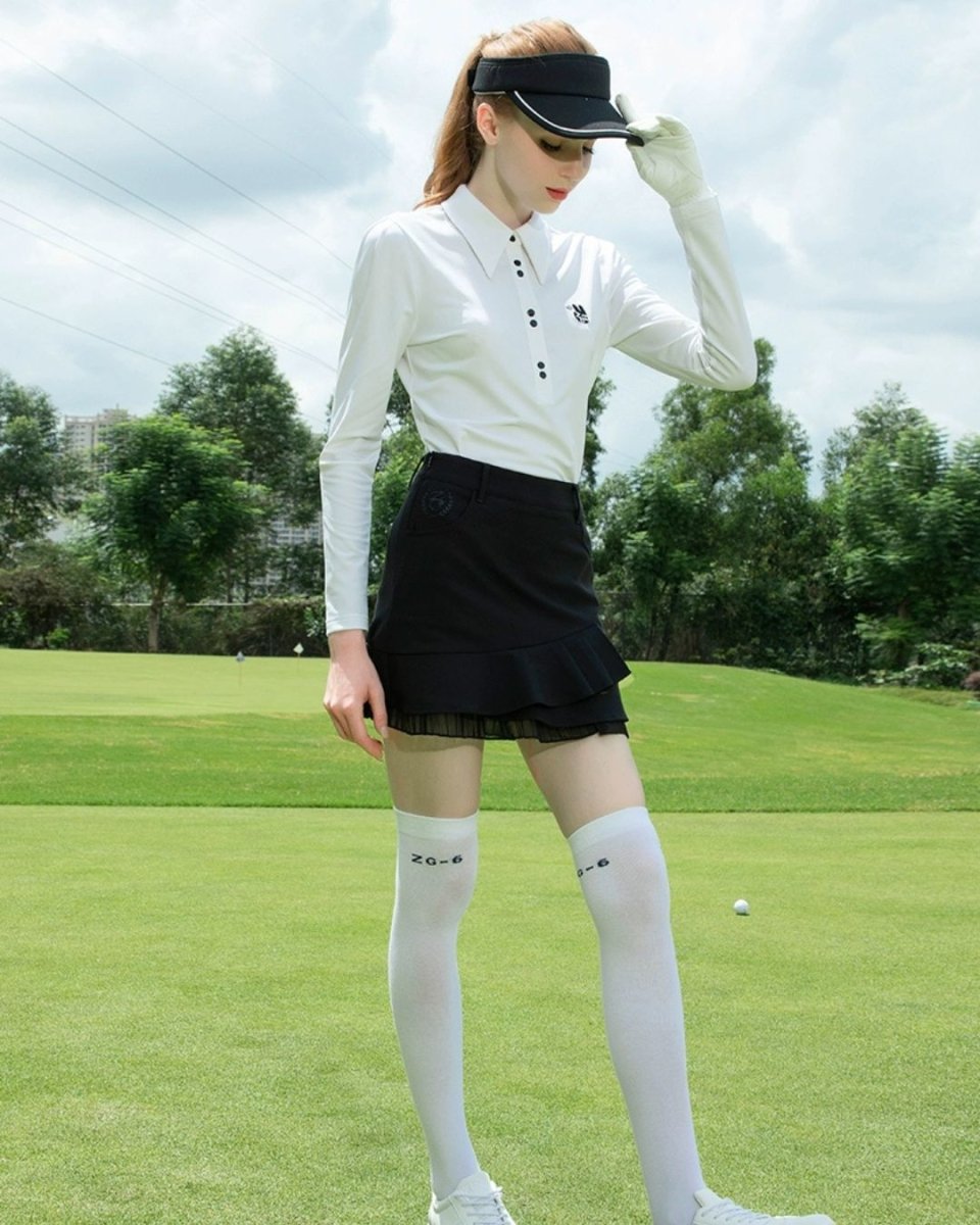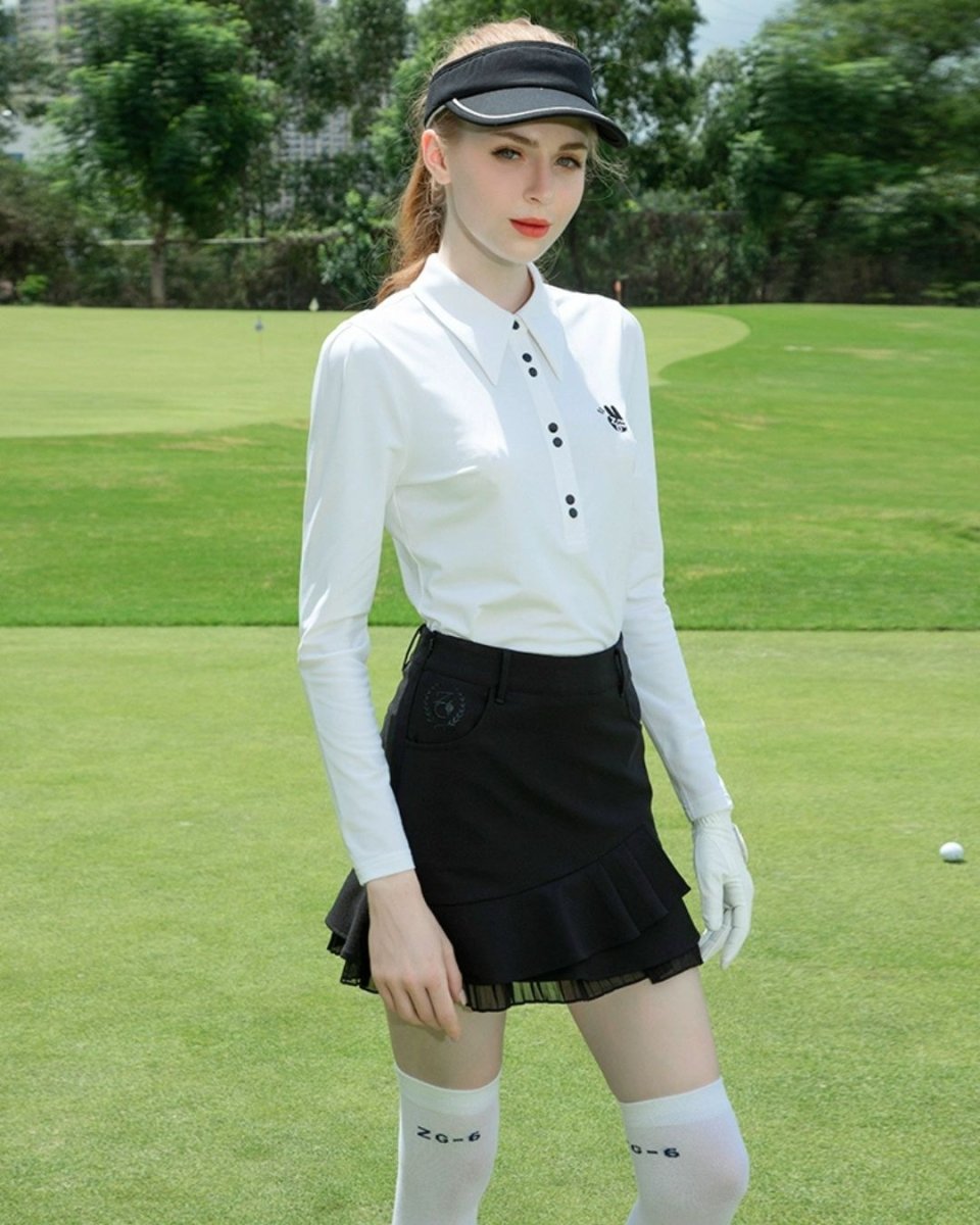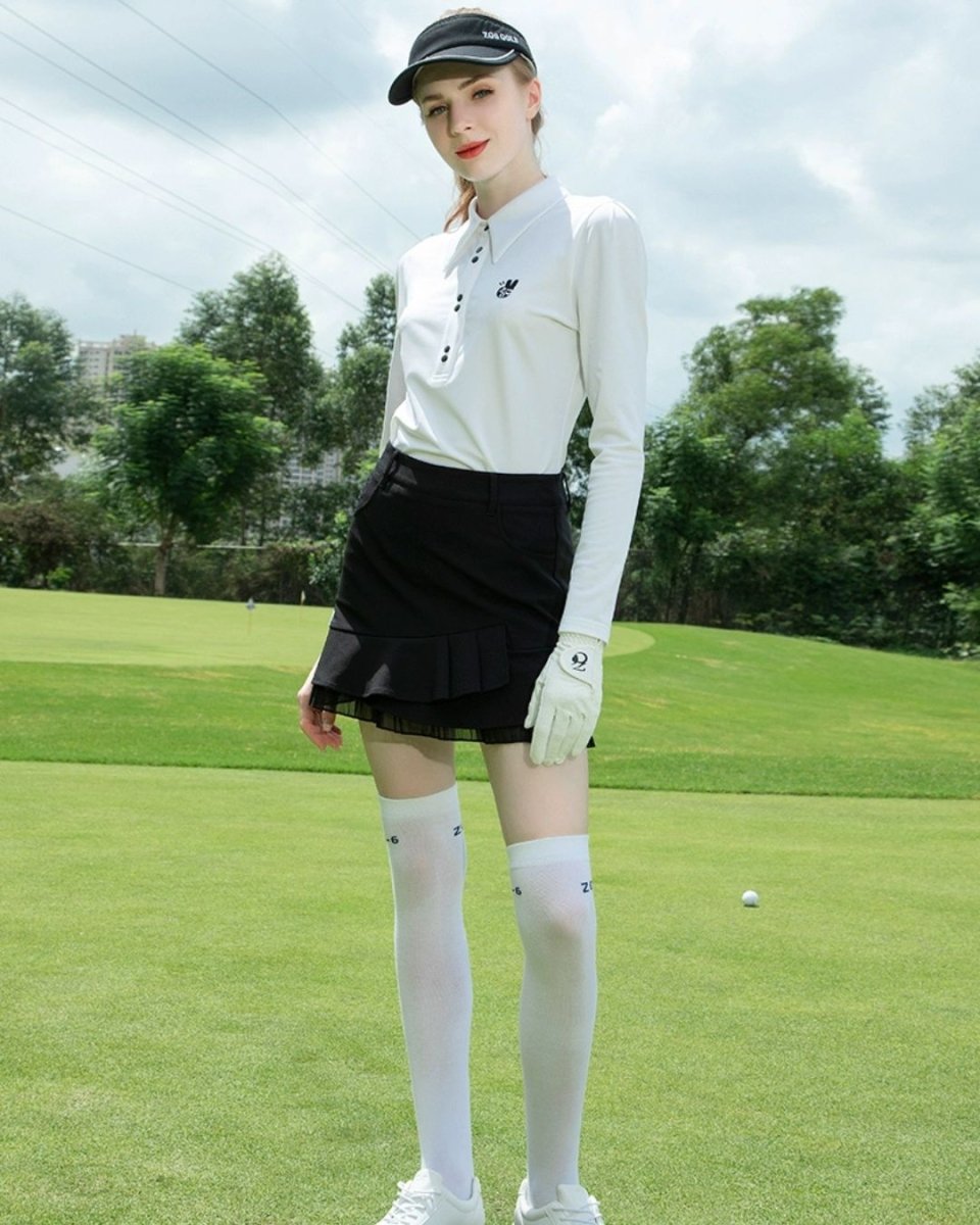 Setelan Golf Wanita ZG-6, Kaos Lengan Panjang Putih, Rok Ramping Hitam