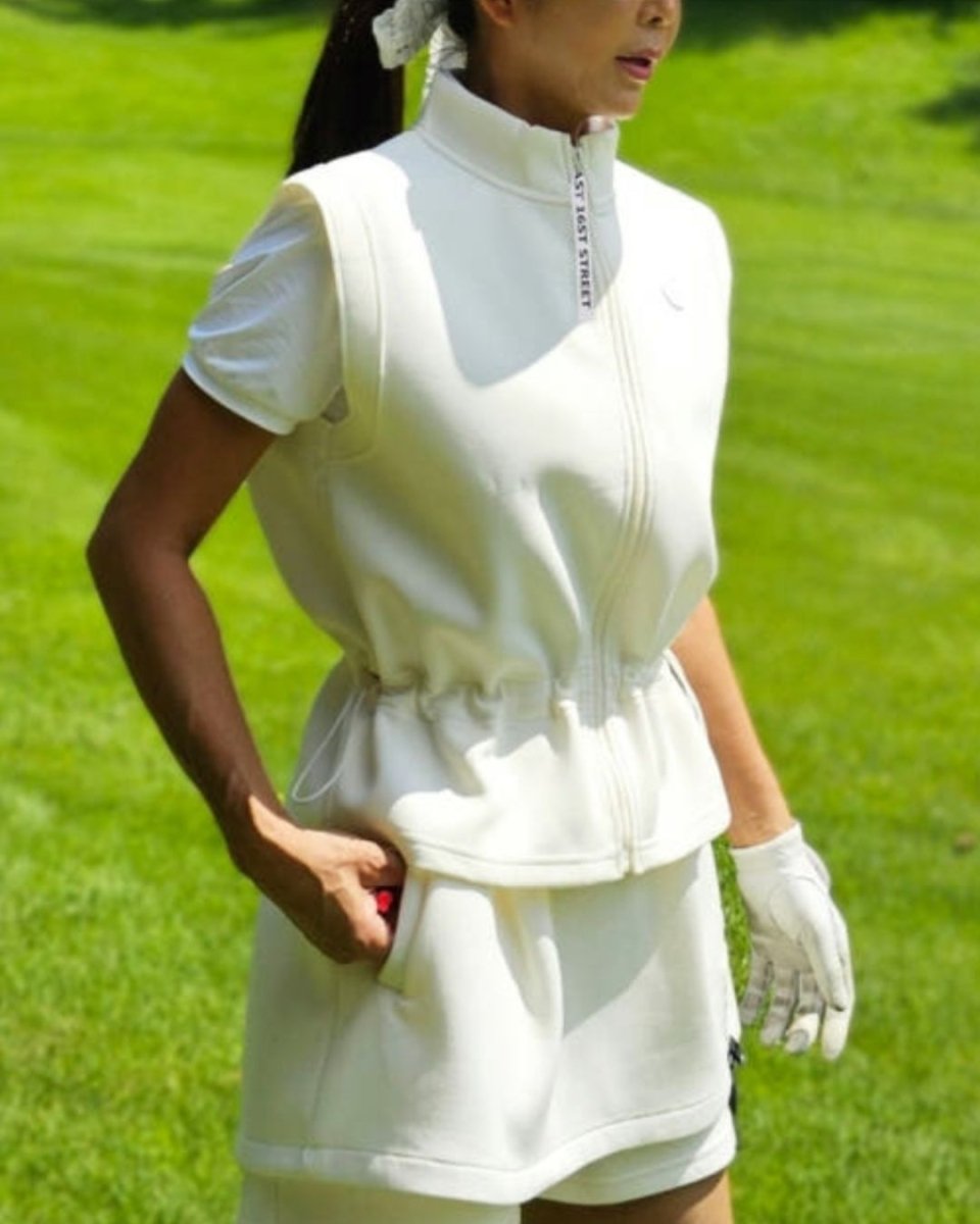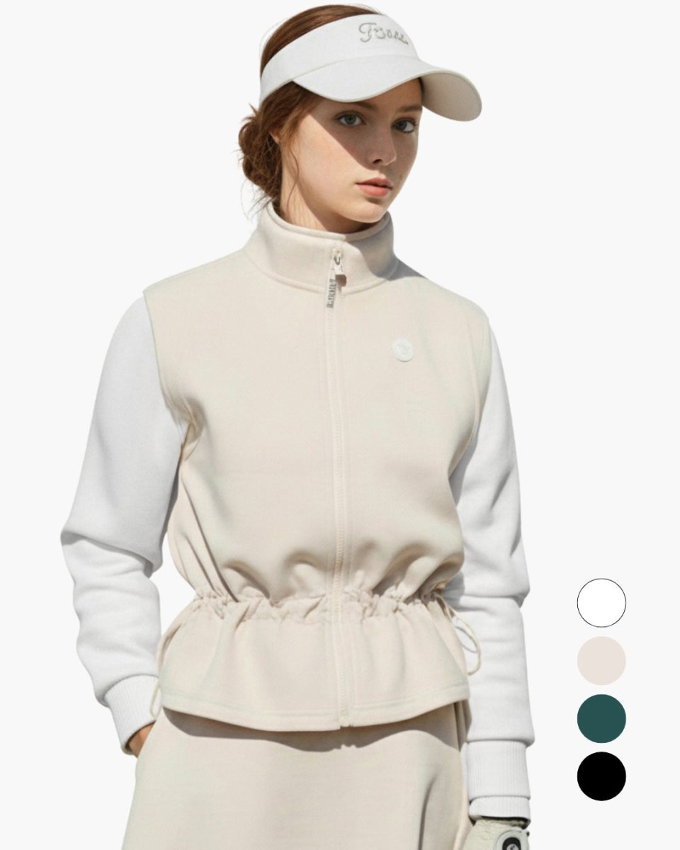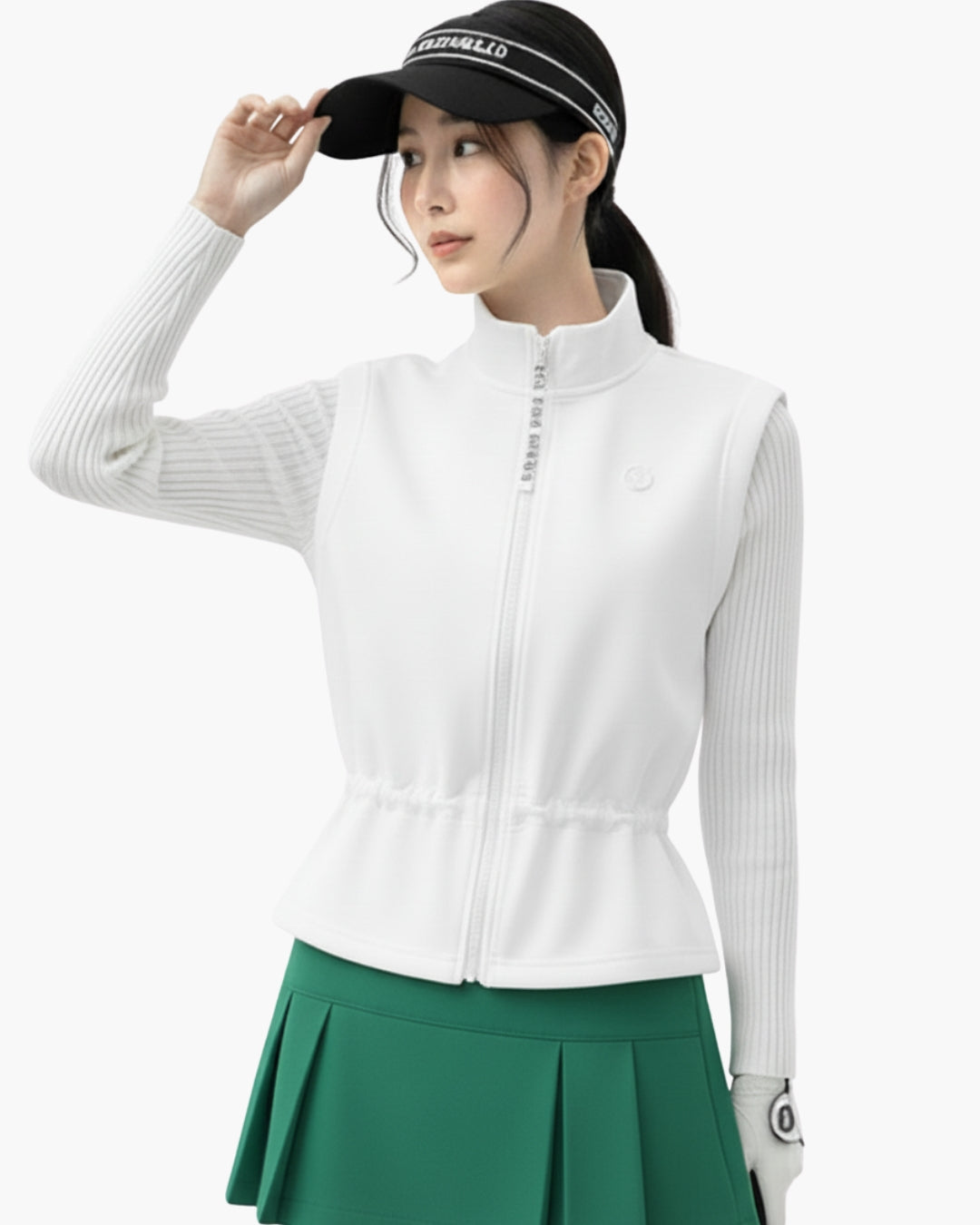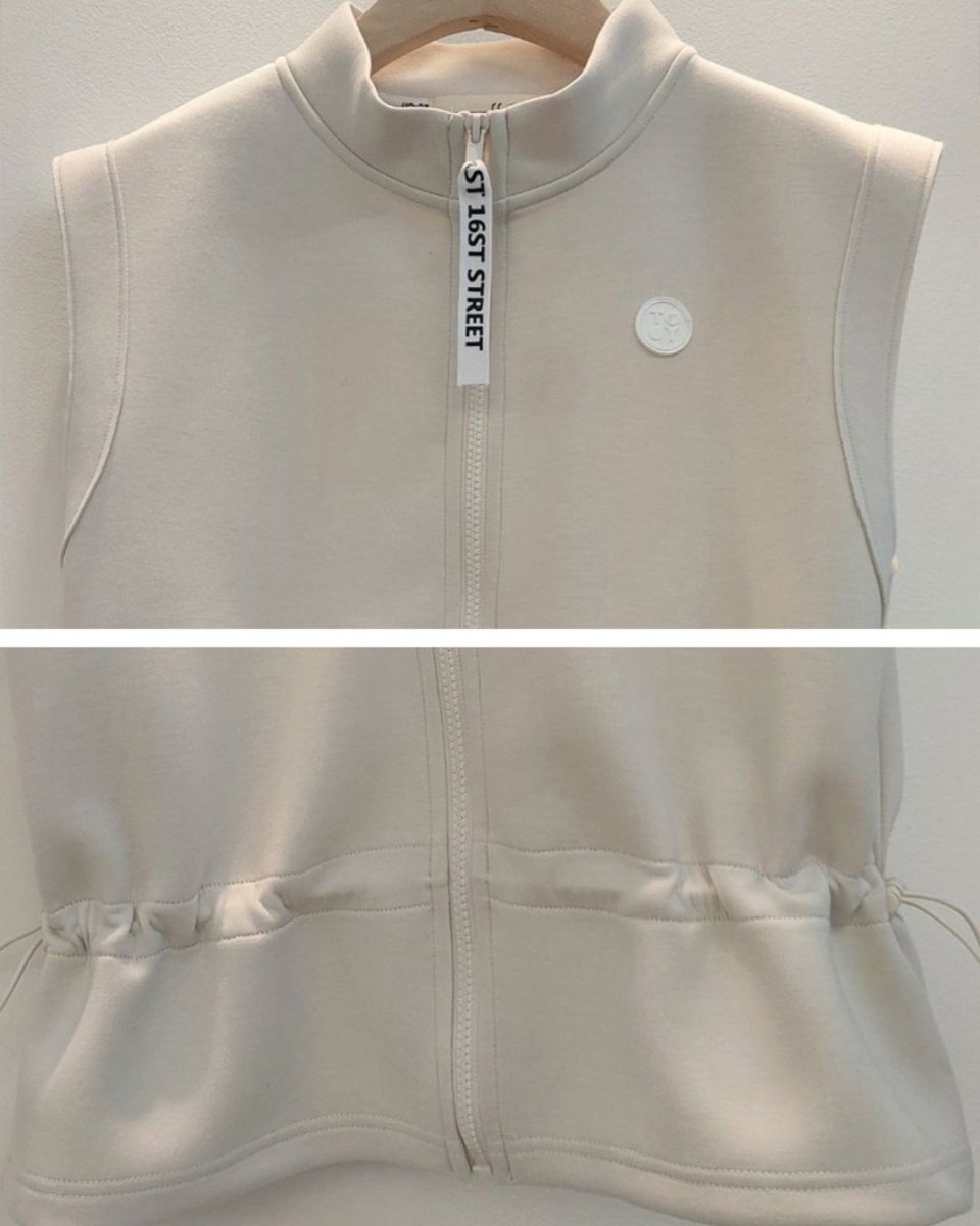 スマートな印象と動きやすさを両立した、ウエストドローストリングデザインのジップベスト。