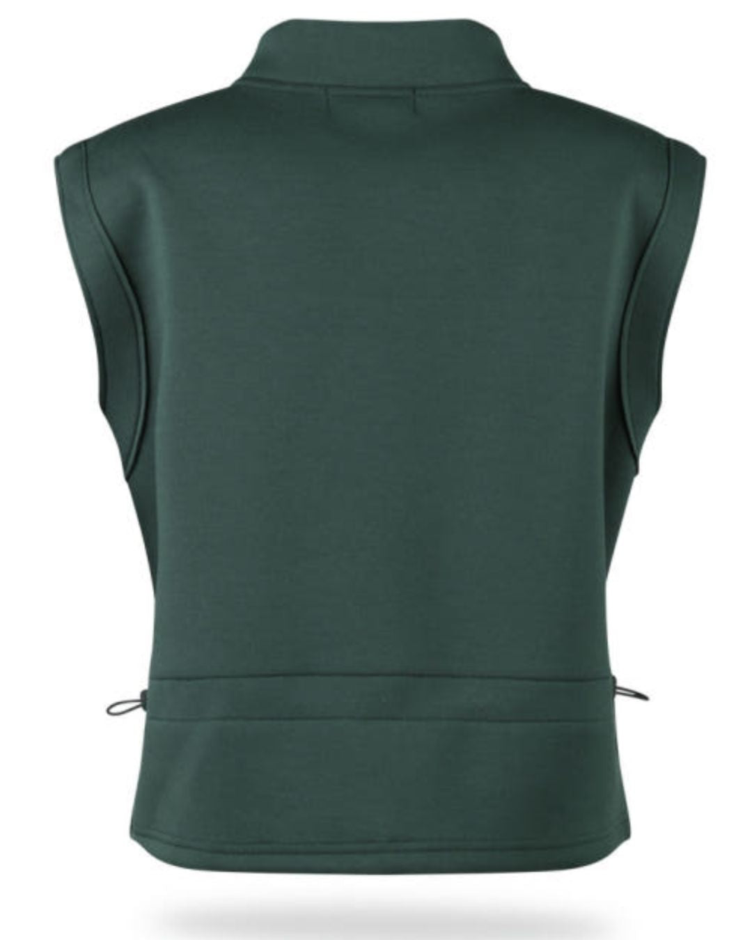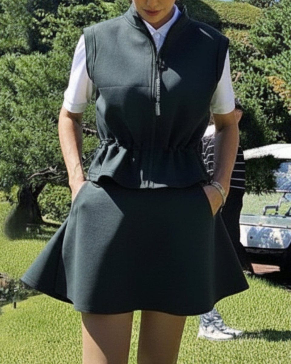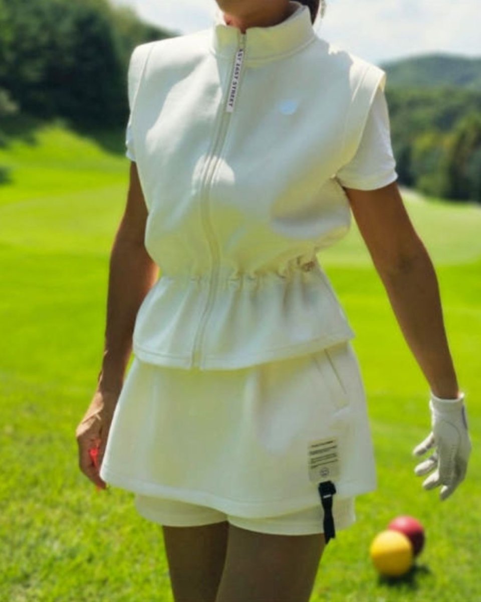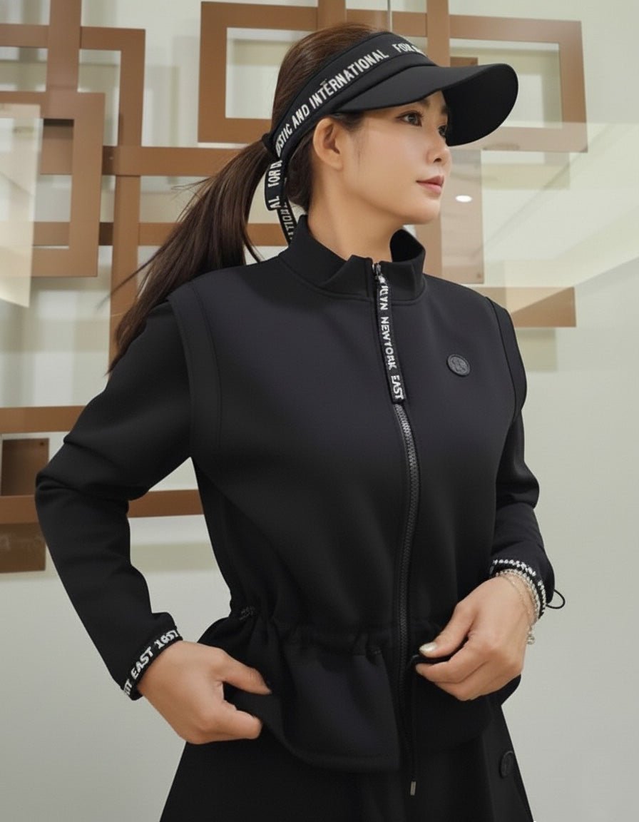 スマートな印象と動きやすさを両立した、ウエストドローストリングデザインのジップベスト。