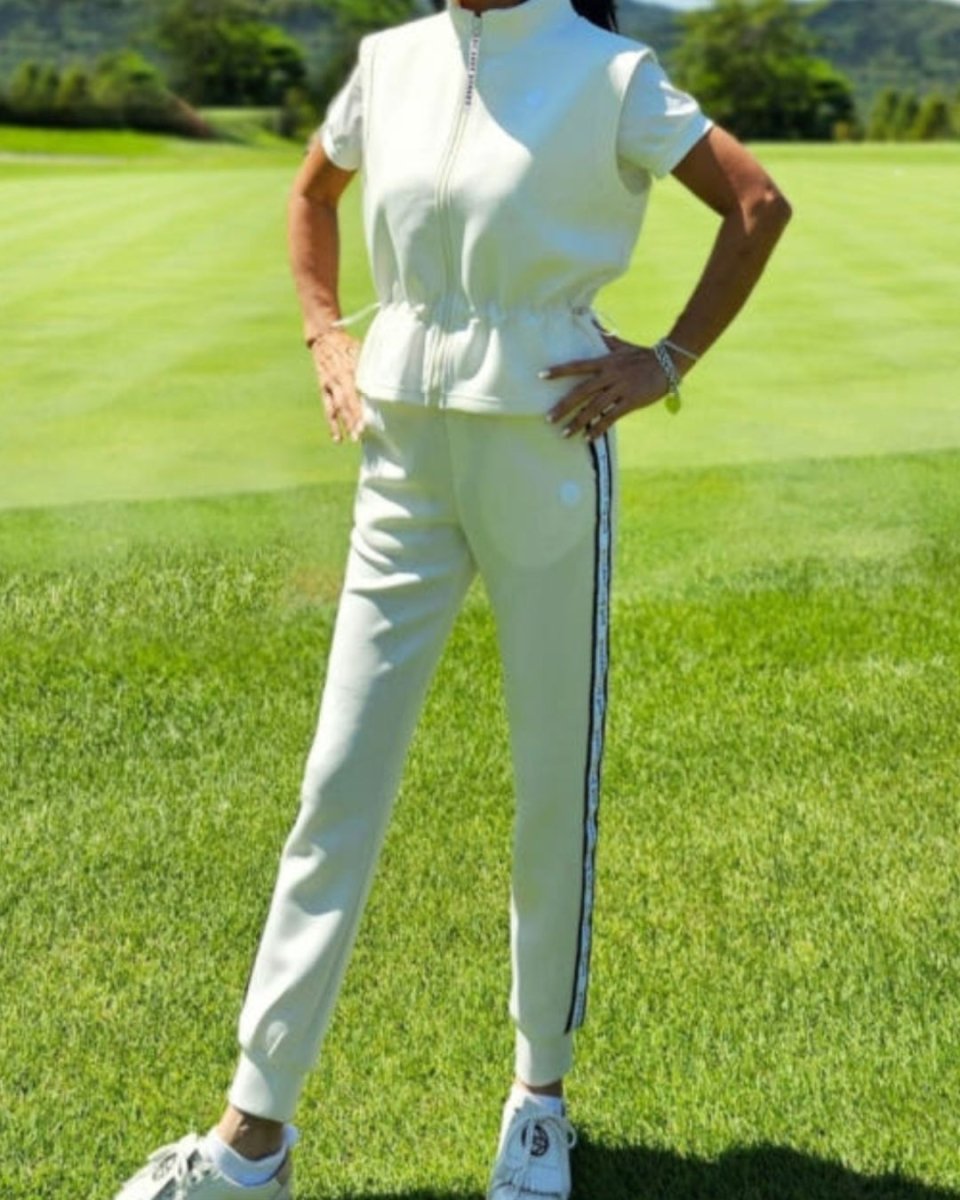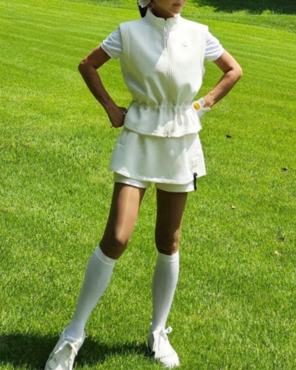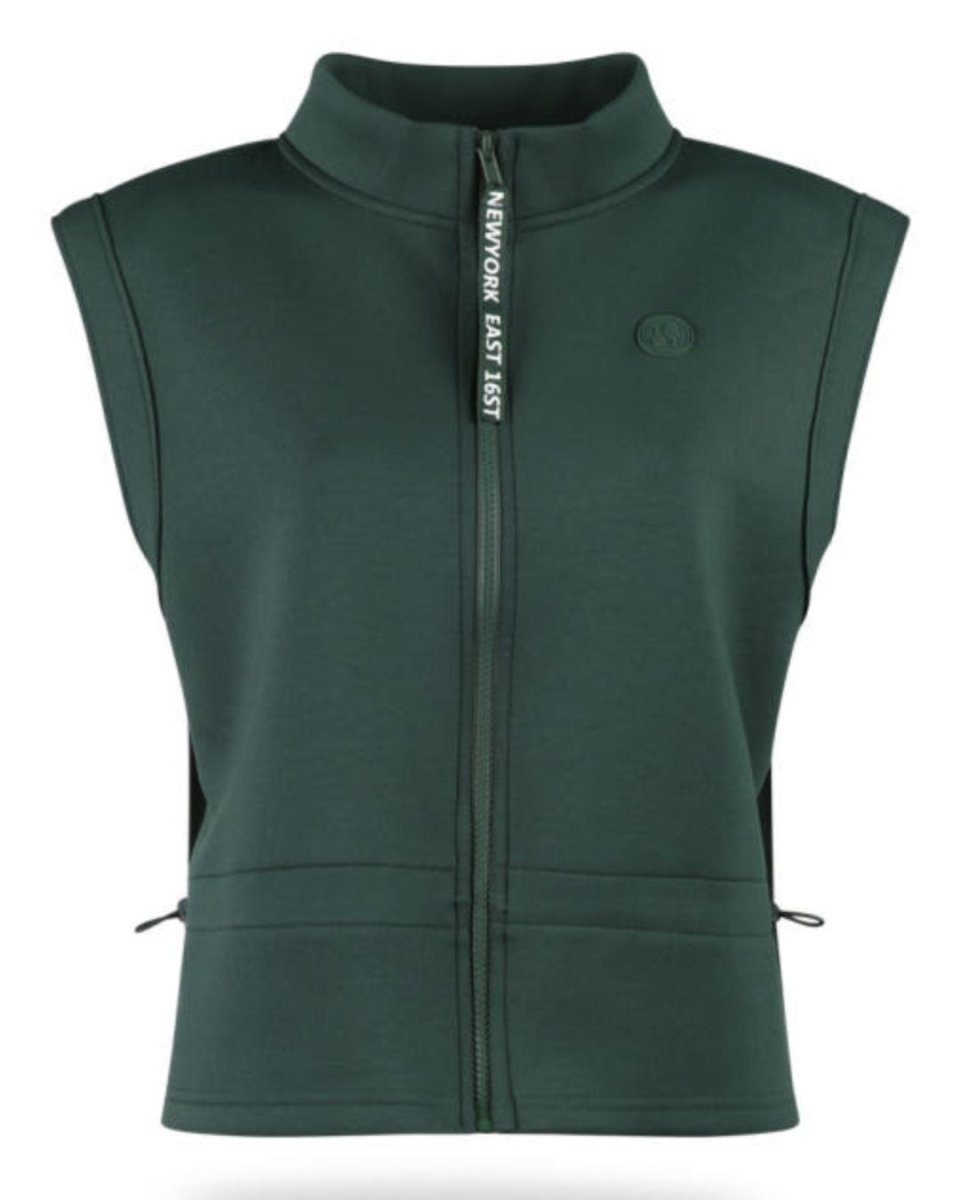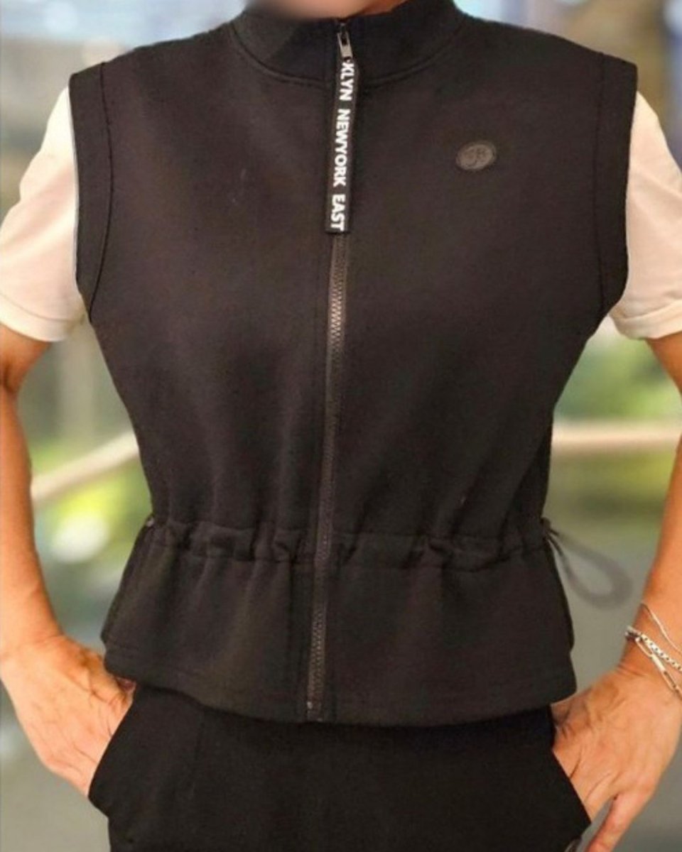 スマートな印象と動きやすさを両立した、ウエストドローストリングデザインのジップベスト。