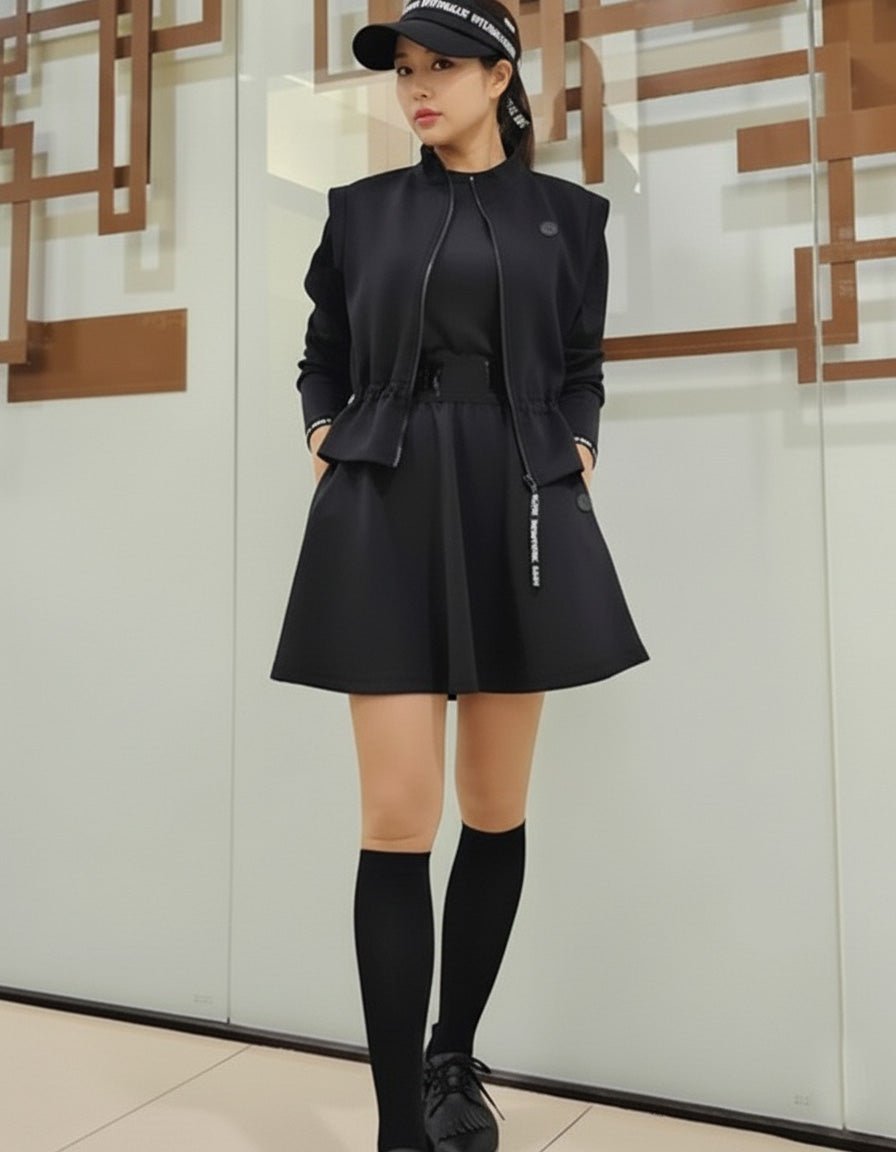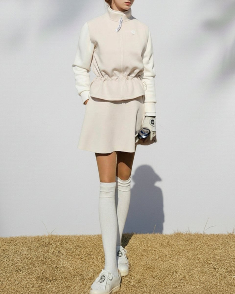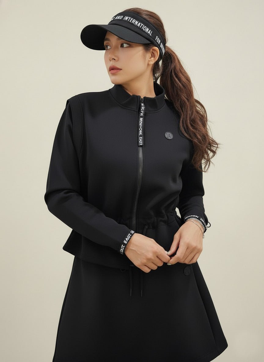 ハイネックとジップラインがスタイリッシュな印象を与え、