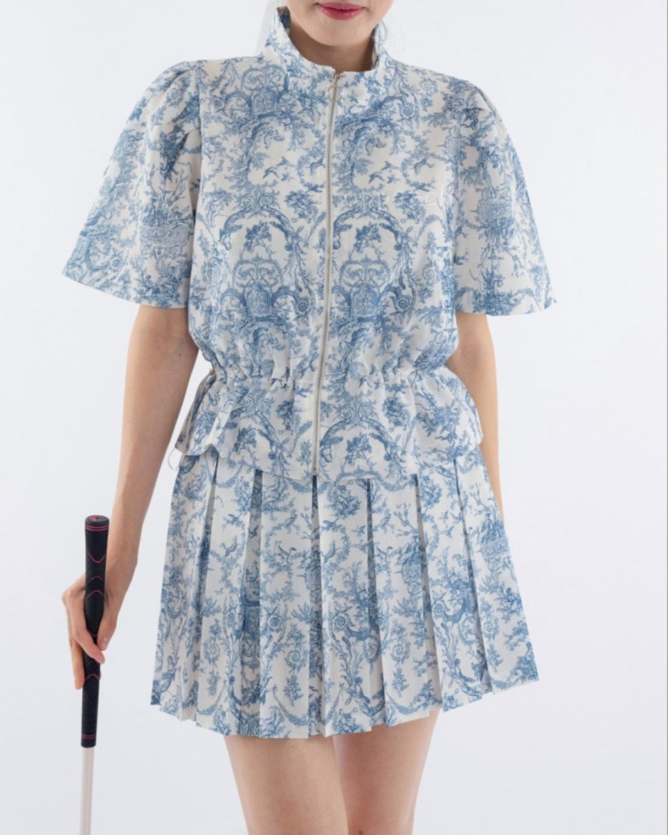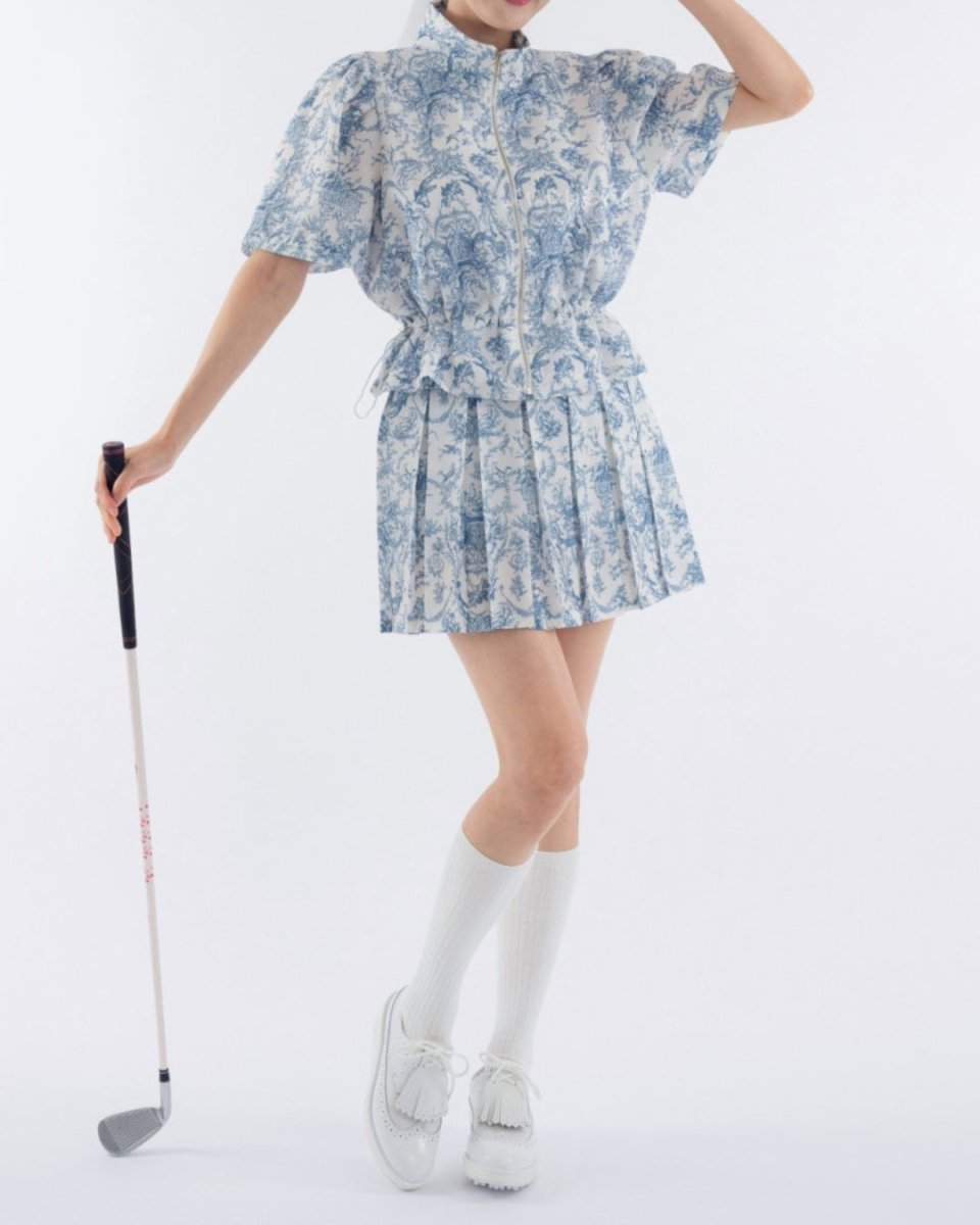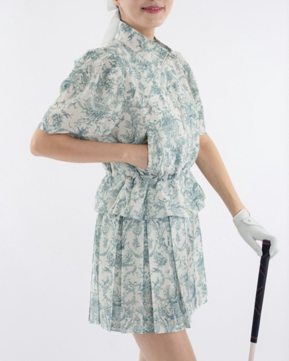 繊細なトワルドジュイ柄が目を引く、上品で華やかなゴルフセットアップ。軽やかな素材とプリーツデザインで、動きのある美しいシルエットを演出します。ウエストは調整可能でスタイルアップも叶える一着。ラウンドでも映える存在感と着心地の良さを兼ね備えたアイテムです。