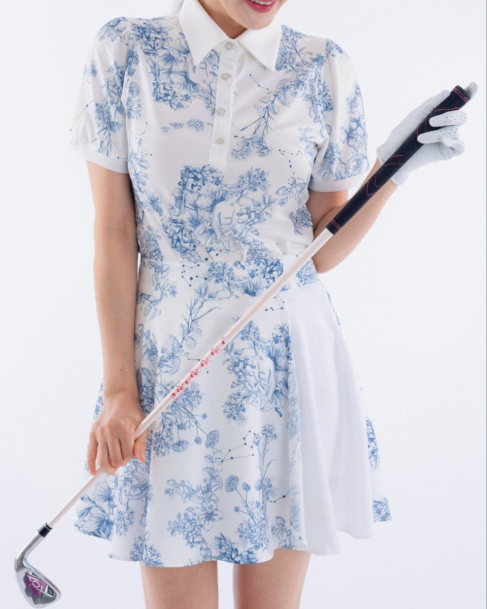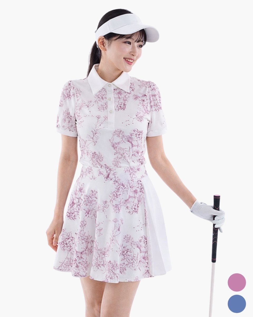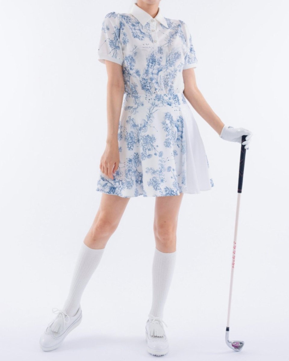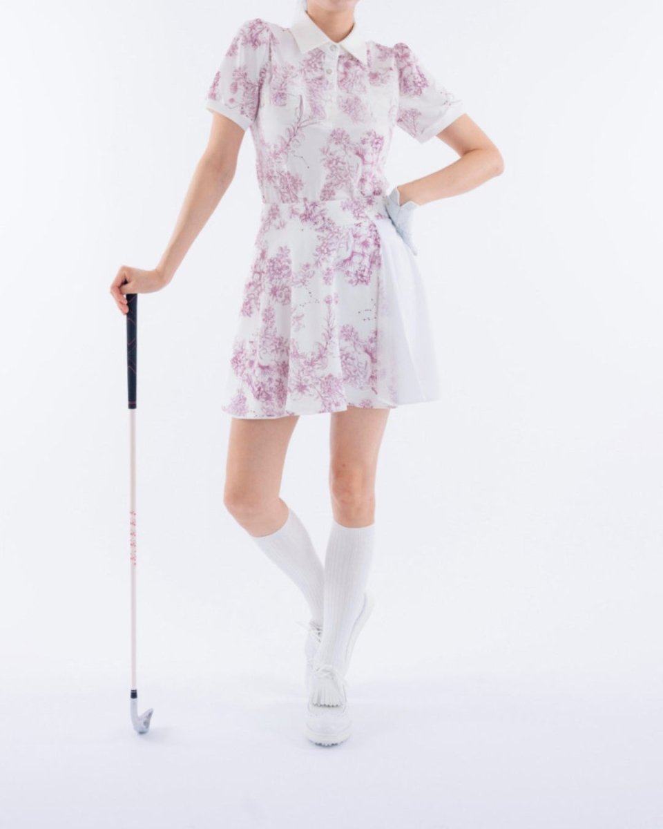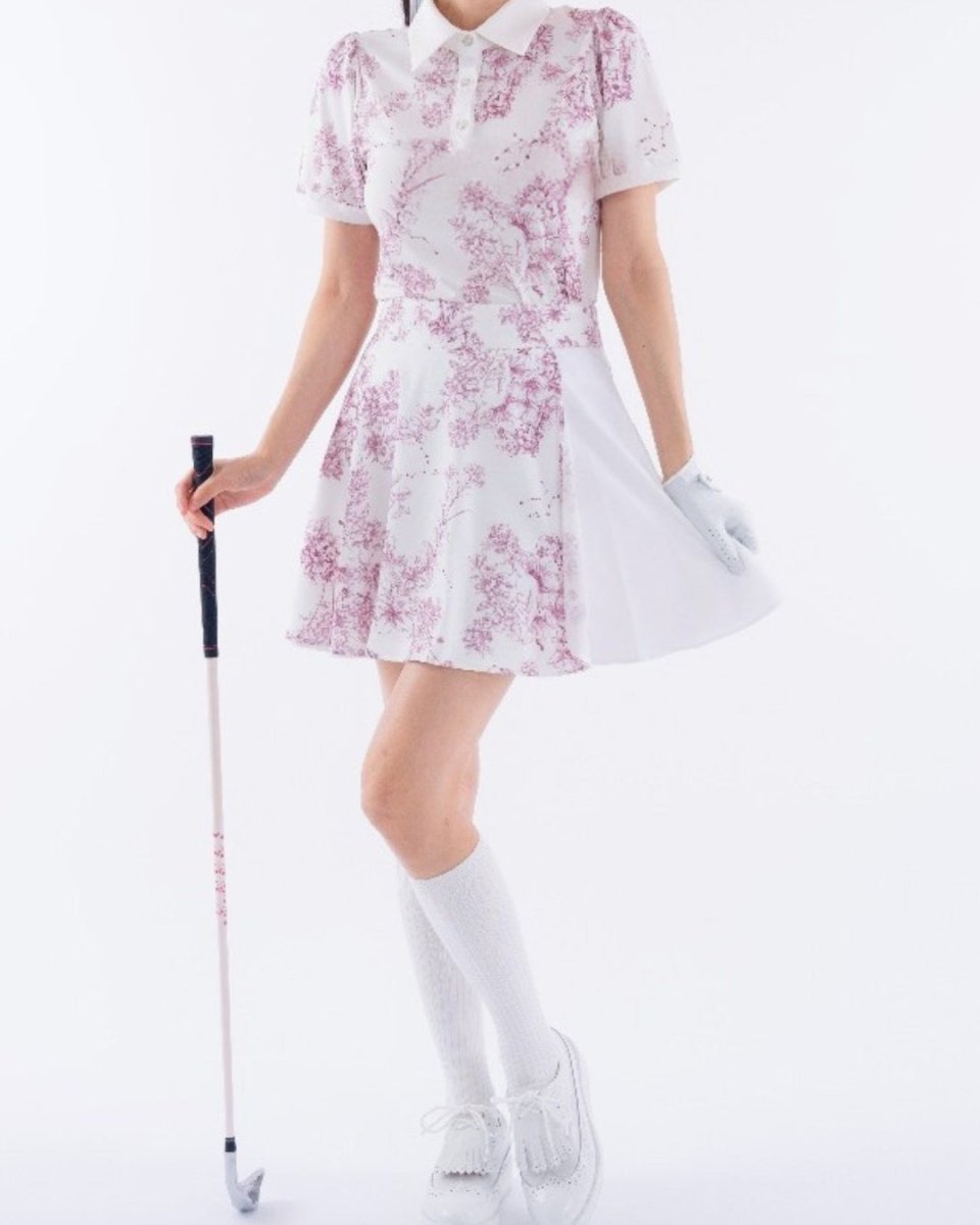 繊細なフローラル柄が印象的な、上品で華やかなゴルフセットアップ。軽やかな素材とふんわりとしたシルエットで、女性らしい柔らかな印象に仕上がります。動きやすさにも配慮され、ラウンド中も快適な着心地。コーデに華やかさをプラスする一着です。