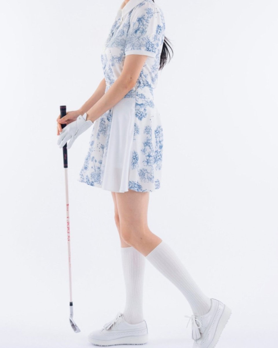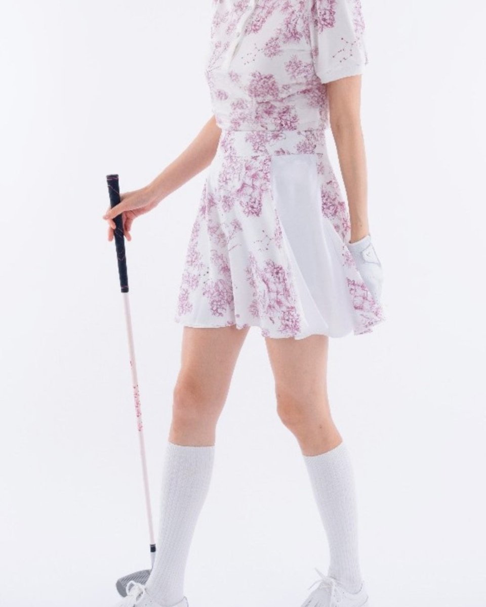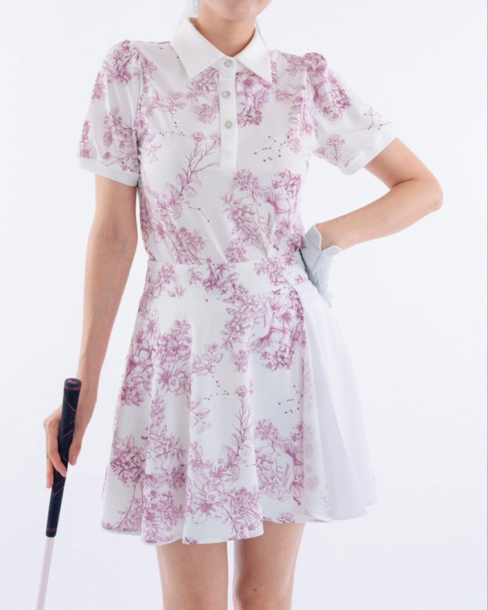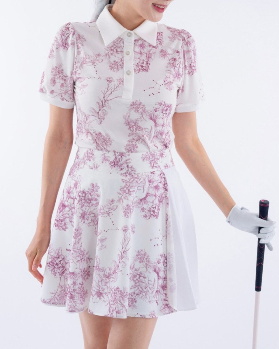 繊細なフローラル柄が印象的な、上品で華やかなゴルフセットアップ。軽やかな素材とふんわりとしたシルエットで、女性らしい柔らかな印象に仕上がります。動きやすさにも配慮され、ラウンド中も快適な着心地。コーデに華やかさをプラスする一着です。