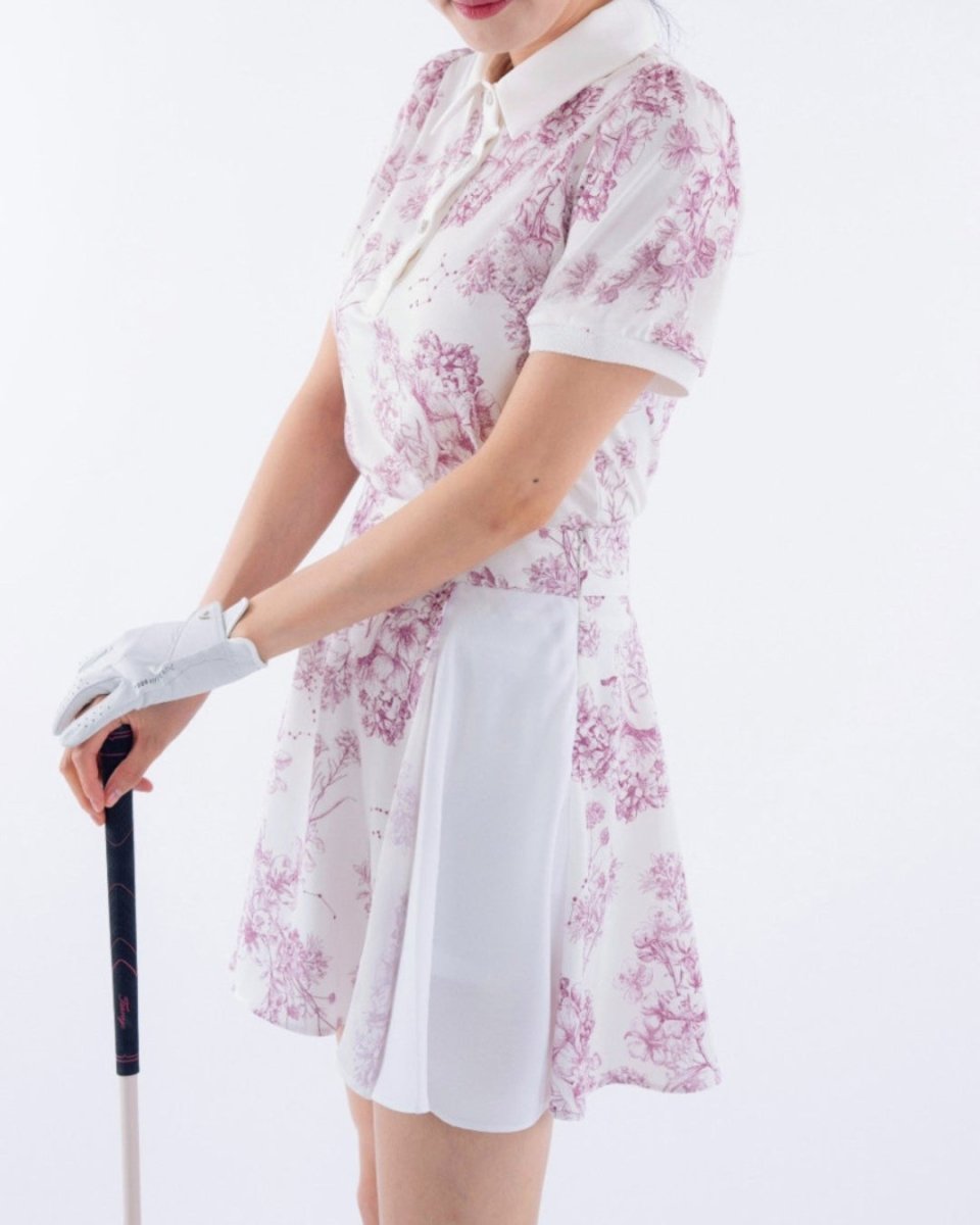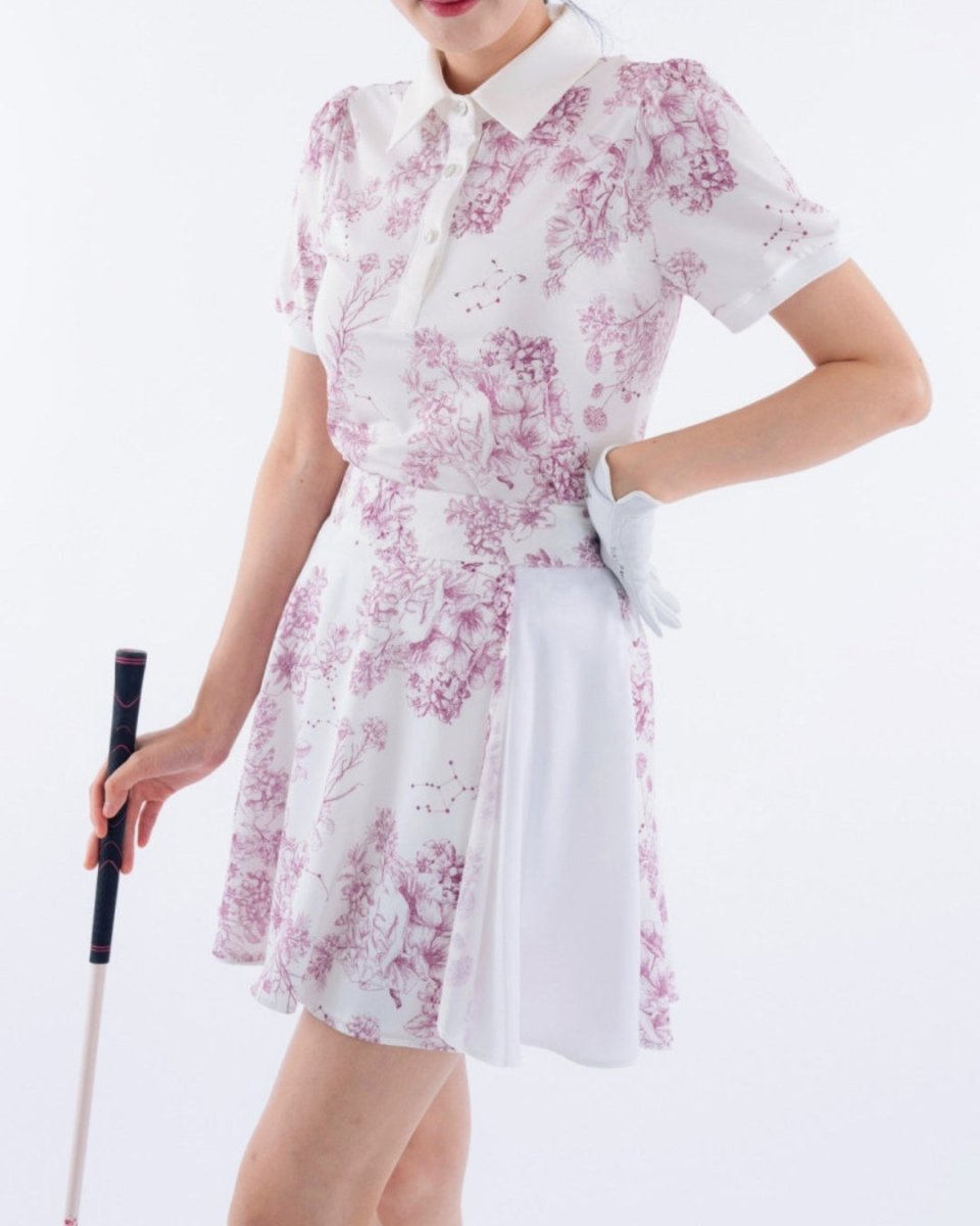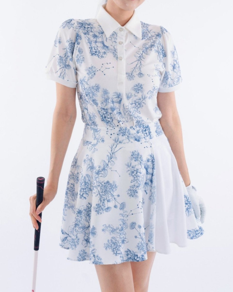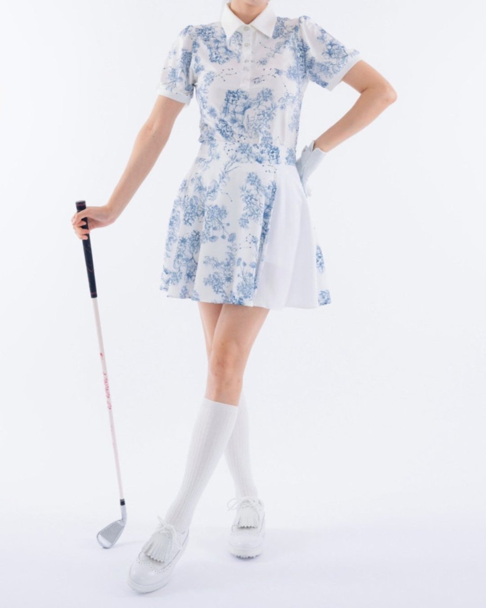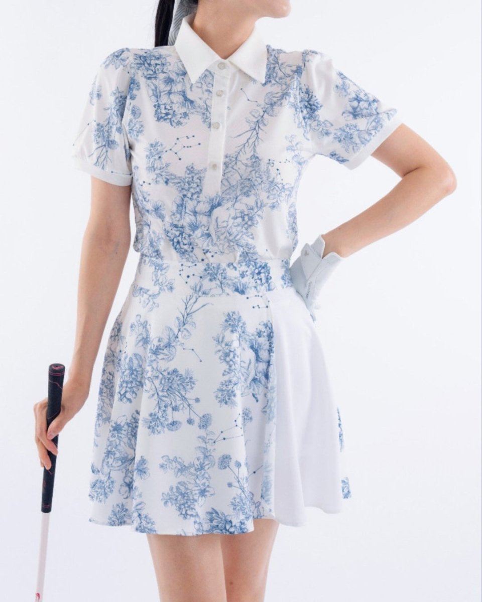 繊細なフローラル柄が印象的な、上品で華やかなゴルフセットアップ。軽やかな素材とふんわりとしたシルエットで、女性らしい柔らかな印象に仕上がります。動きやすさにも配慮され、ラウンド中も快適な着心地。コーデに華やかさをプラスする一着です。