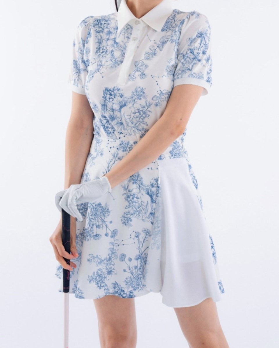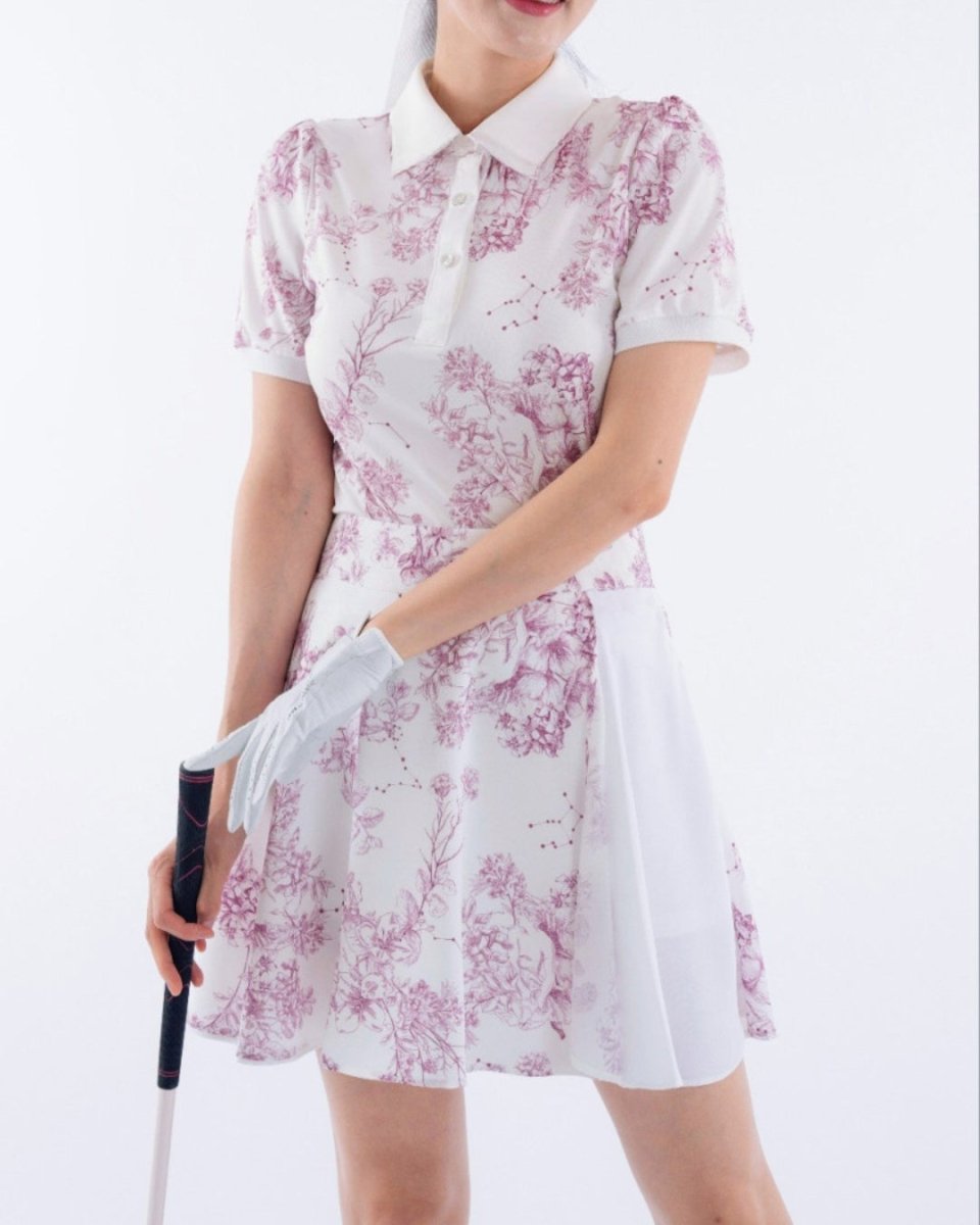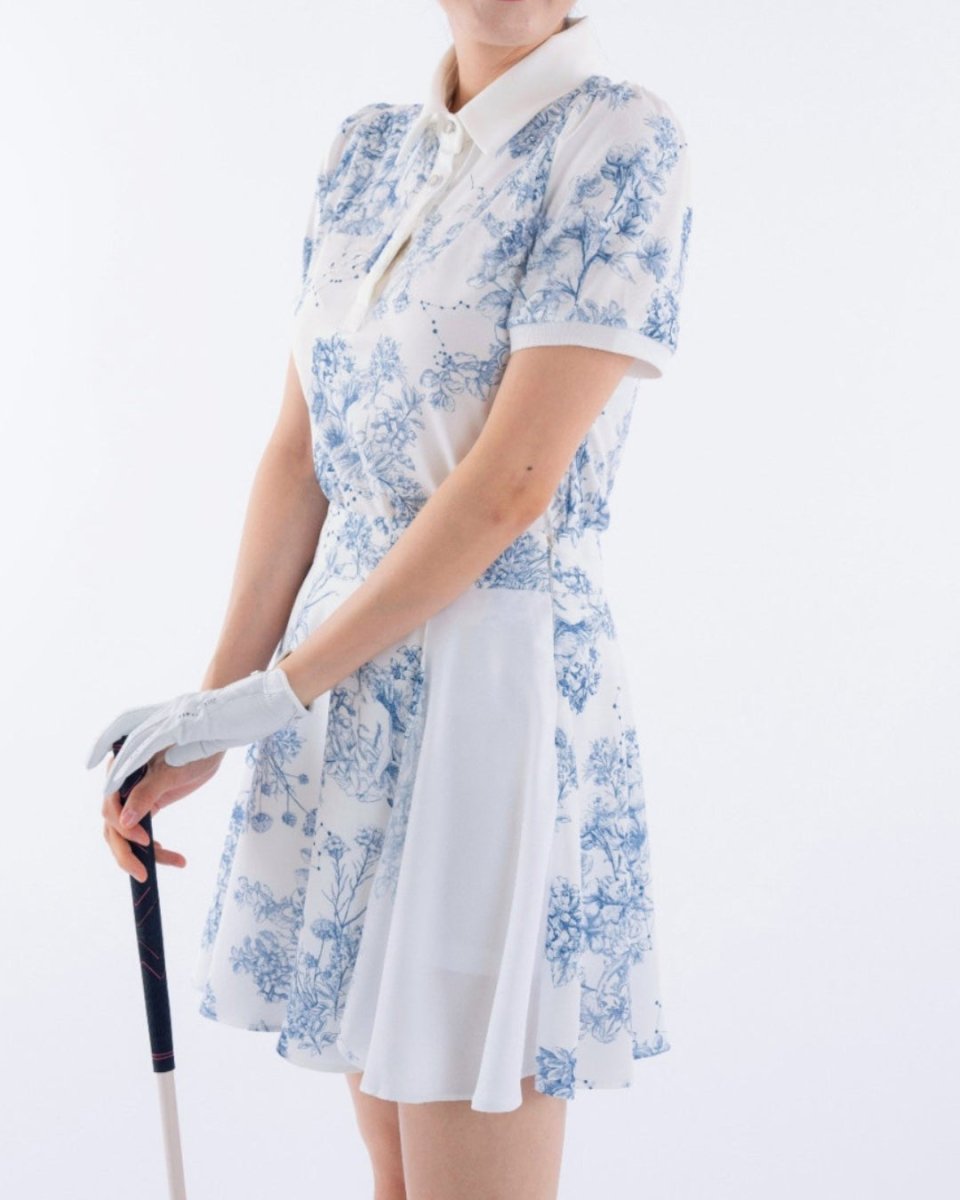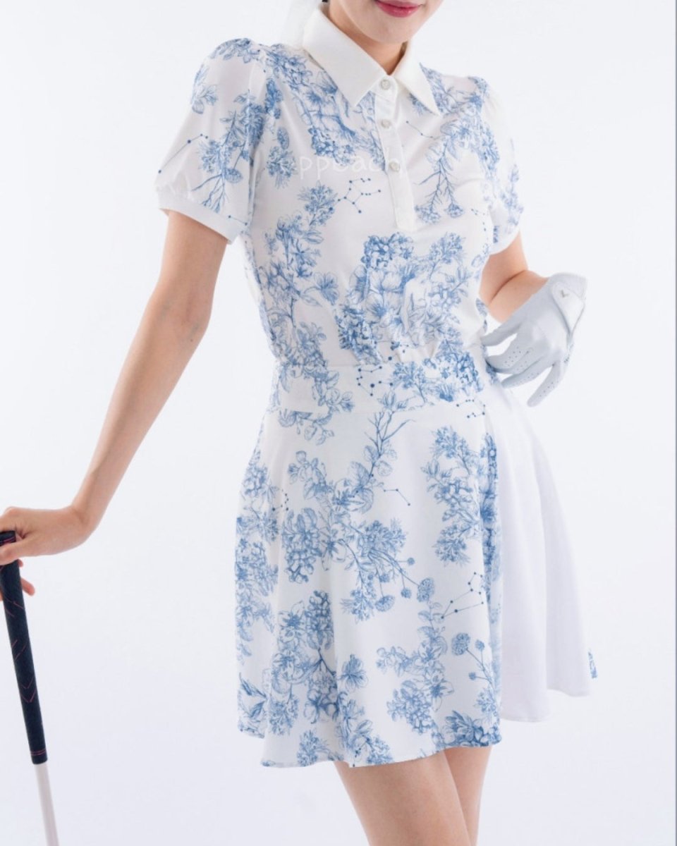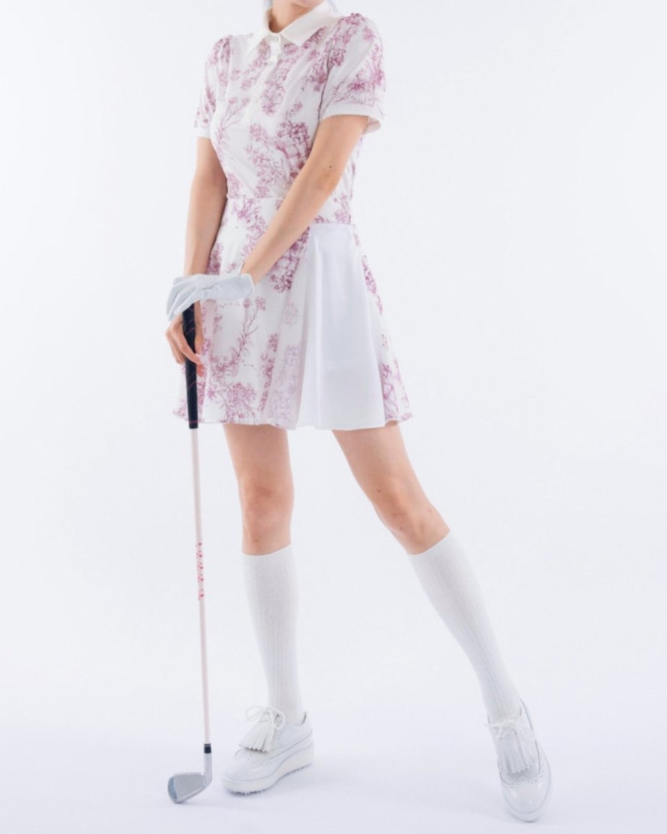 繊細なフローラル柄が印象的な、上品で華やかなゴルフセットアップ。軽やかな素材とふんわりとしたシルエットで、女性らしい柔らかな印象に仕上がります。動きやすさにも配慮され、ラウンド中も快適な着心地。コーデに華やかさをプラスする一着です。