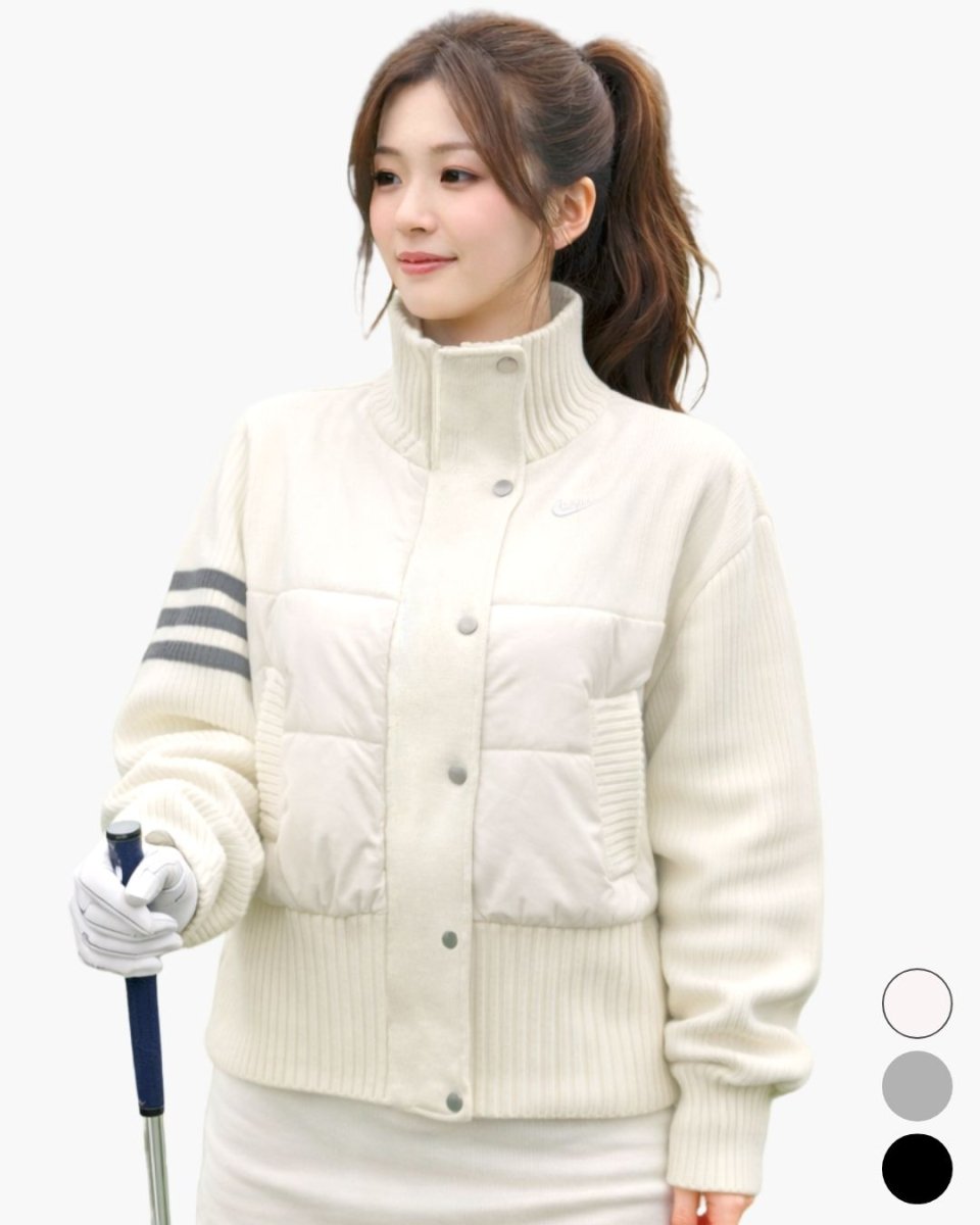 ニット袖と中綿ベストを組み合わせた、デザイン性と防寒性を兼ね備えたゴルフアウター。動かしやすいニット素材に、体幹を暖める中綿仕様で秋冬のラウンドに最適。腕のラインデザインがスポーティーさを演出し、ゴルフはもちろんタウンユースにも対応。軽量で着心地が良く、レディースゴルフウェアとして幅広いコーデに活躍します。